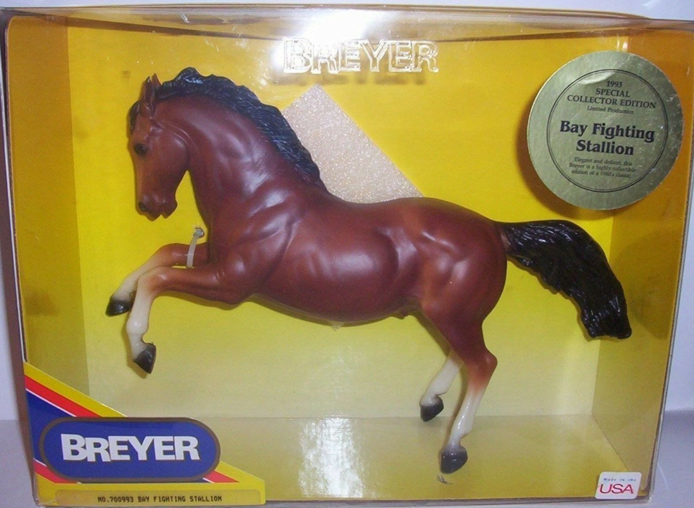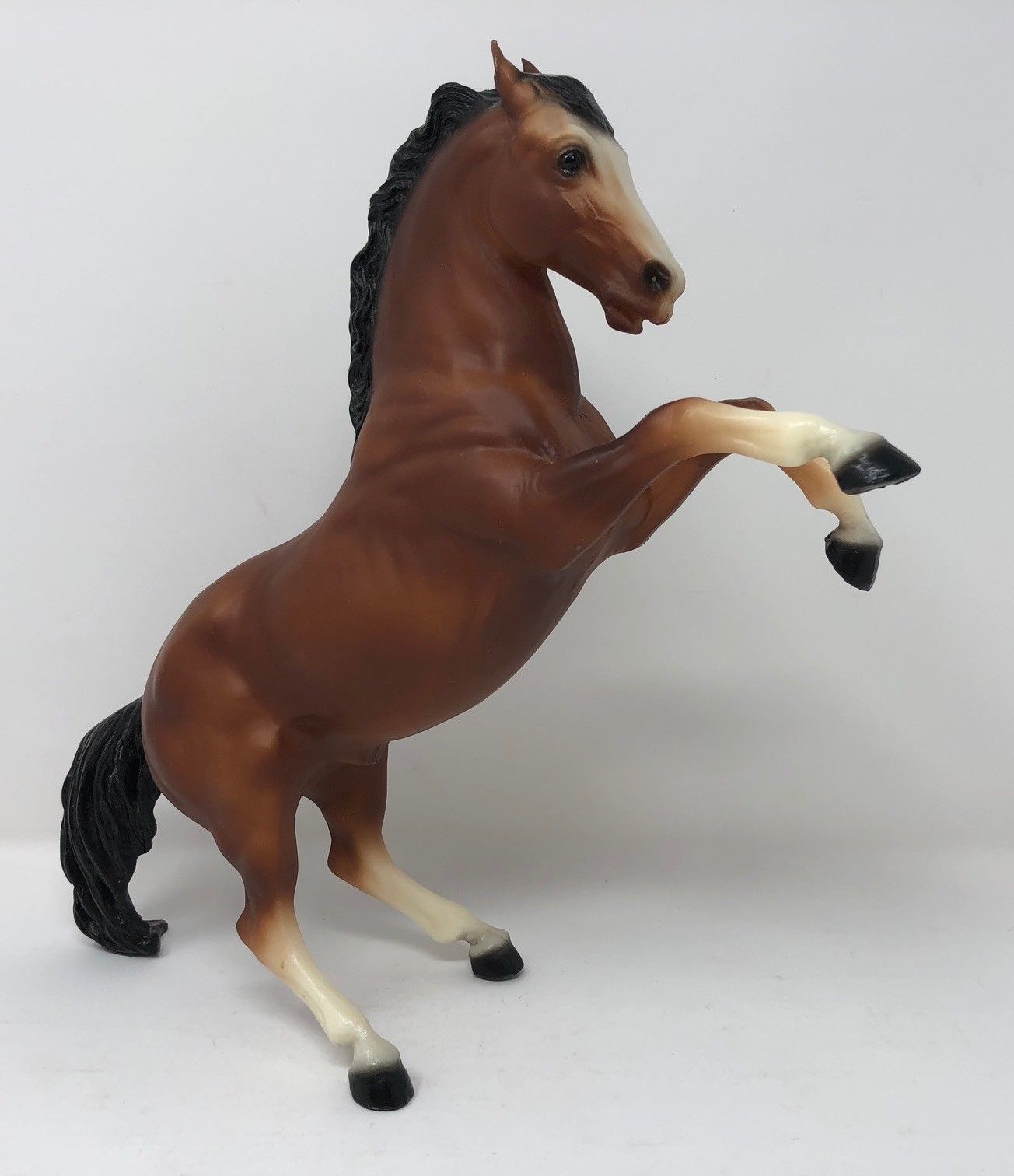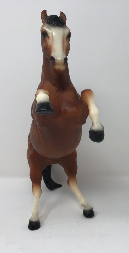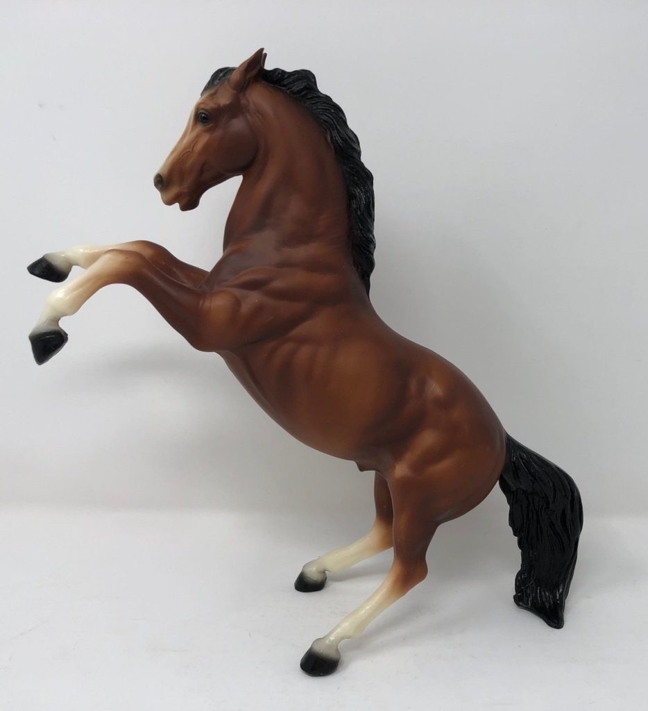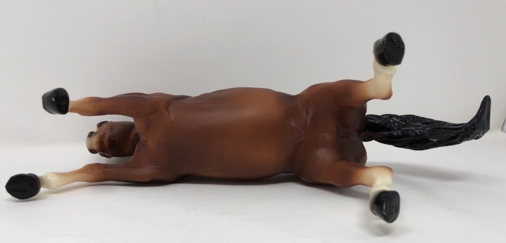 Matte bay; bald face; 4 stockings; black hooves; Toys R Us SR