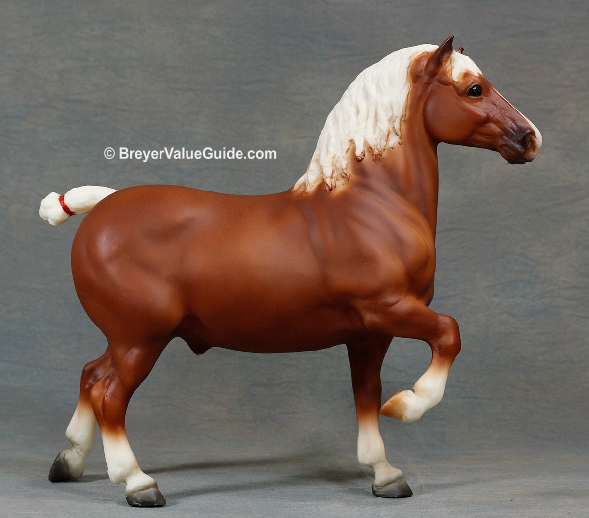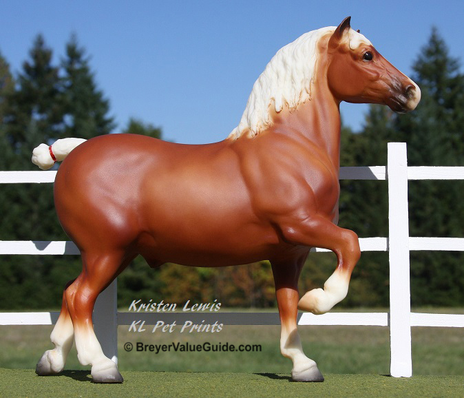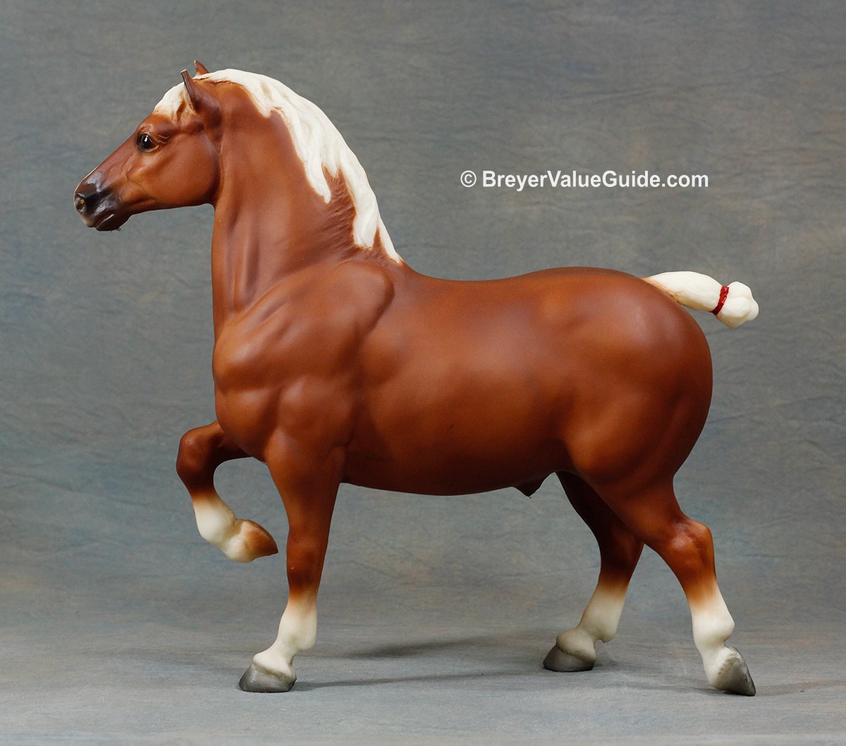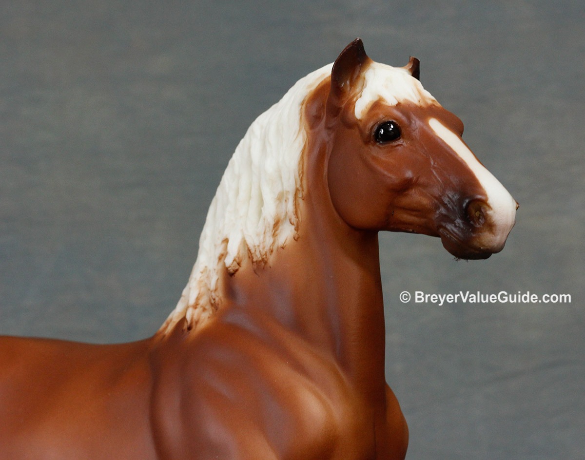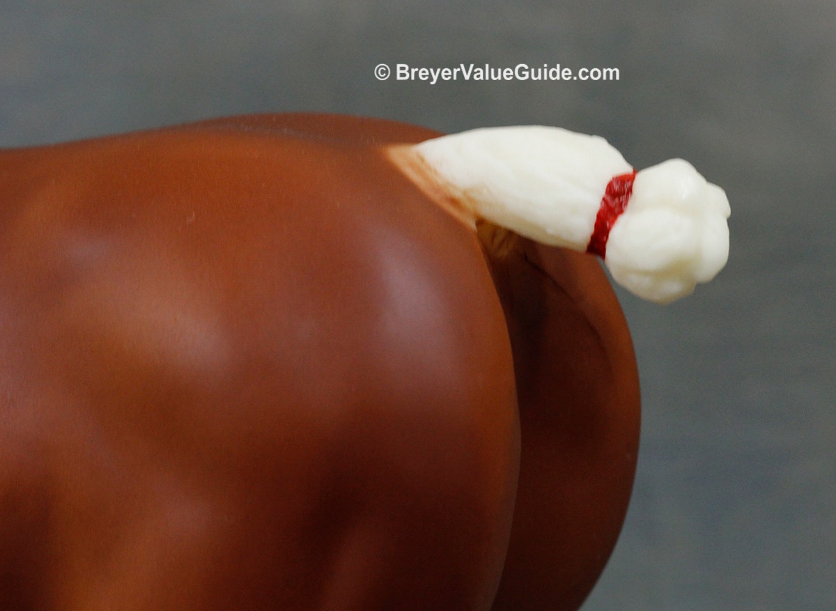 Matte red sorrel; white mane and tail; blaze; 4 socks; 3 grey hooves; red tail ribbon