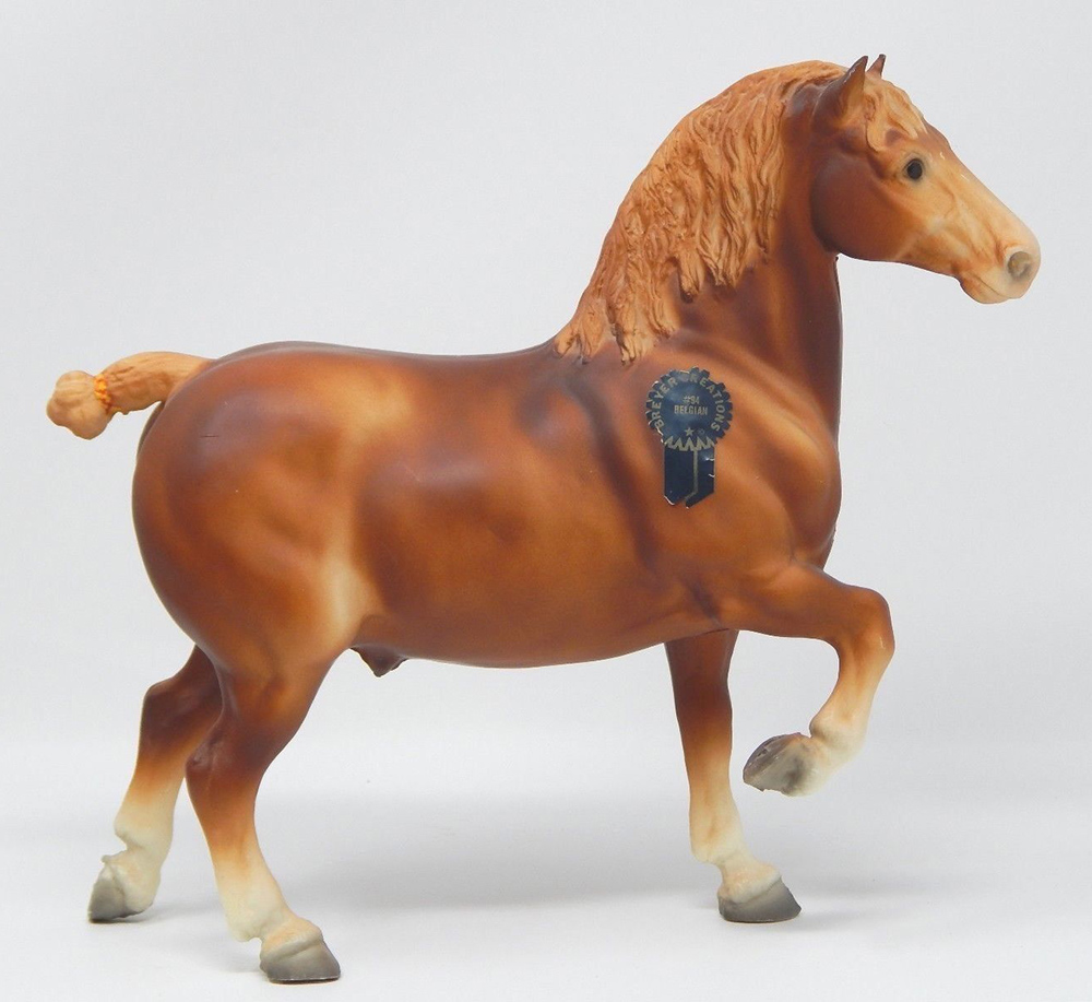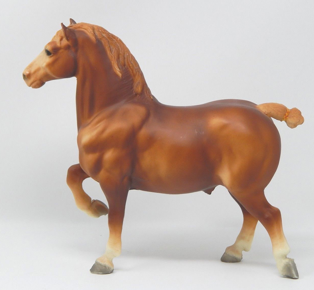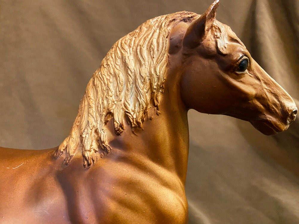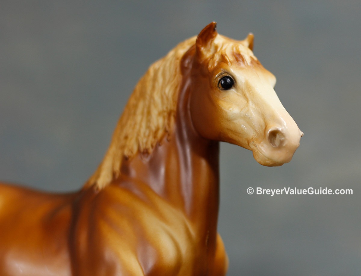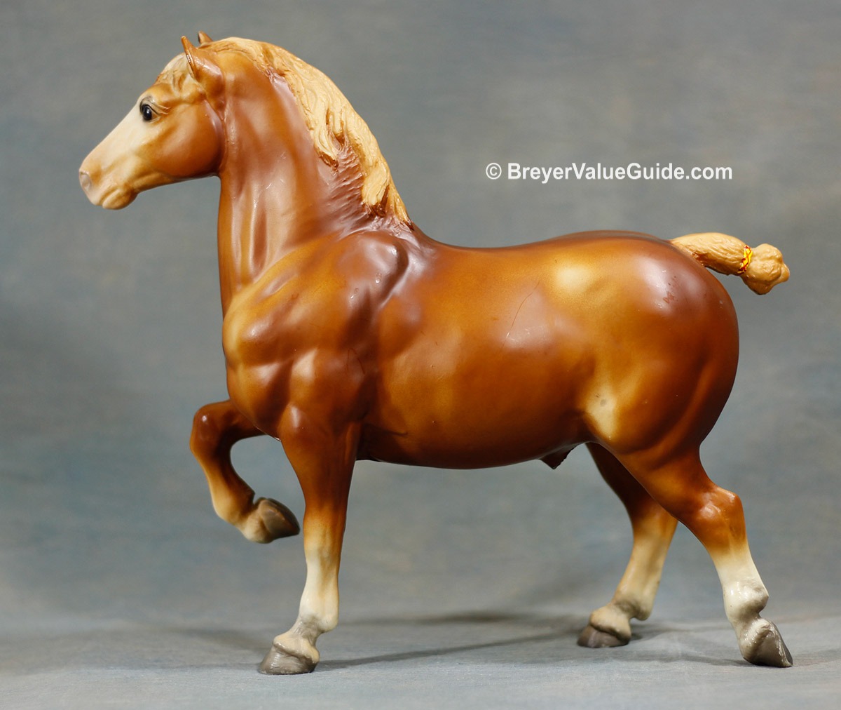 Matte chestnut/sorrel; flaxen mane and tail; bald face; 4 stockings; red on yellow tail ribbon