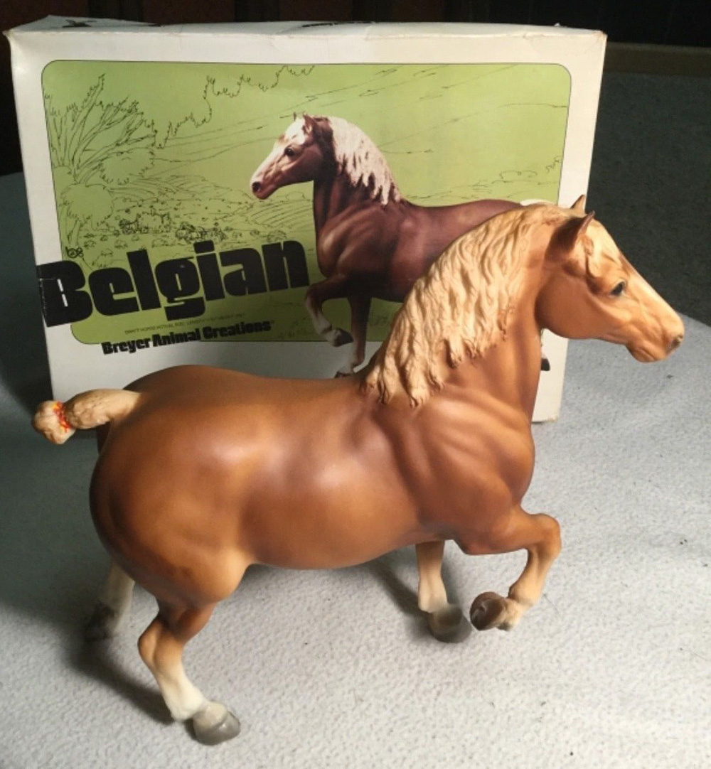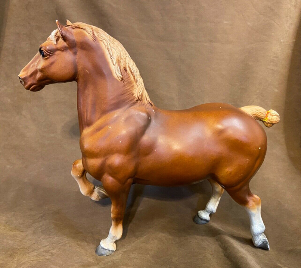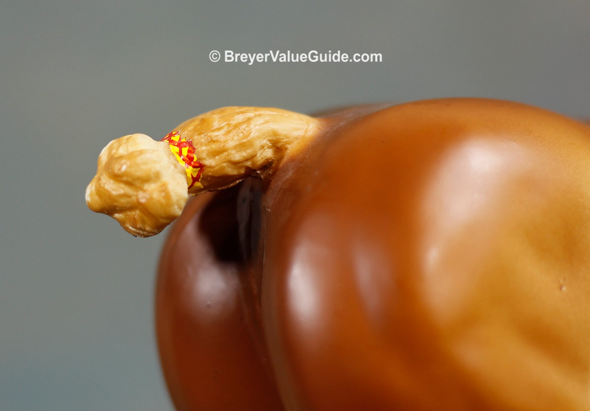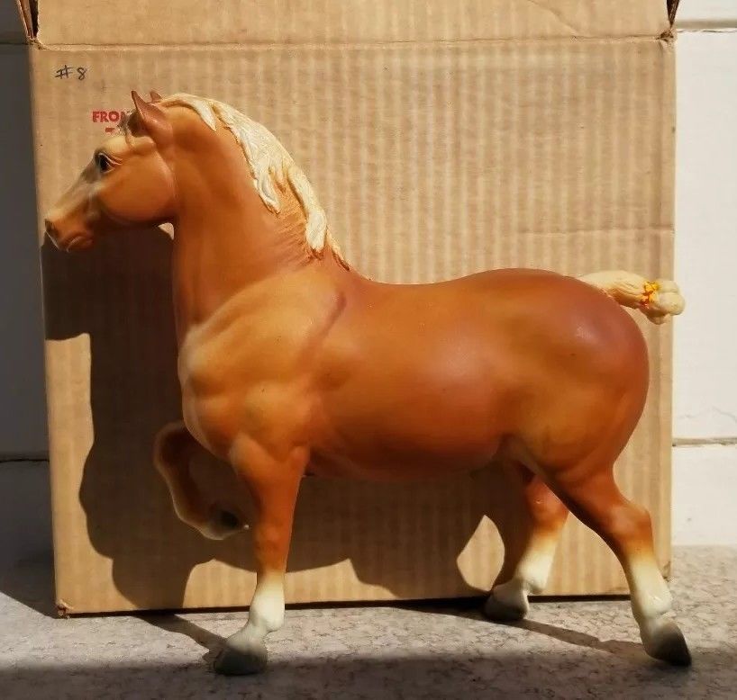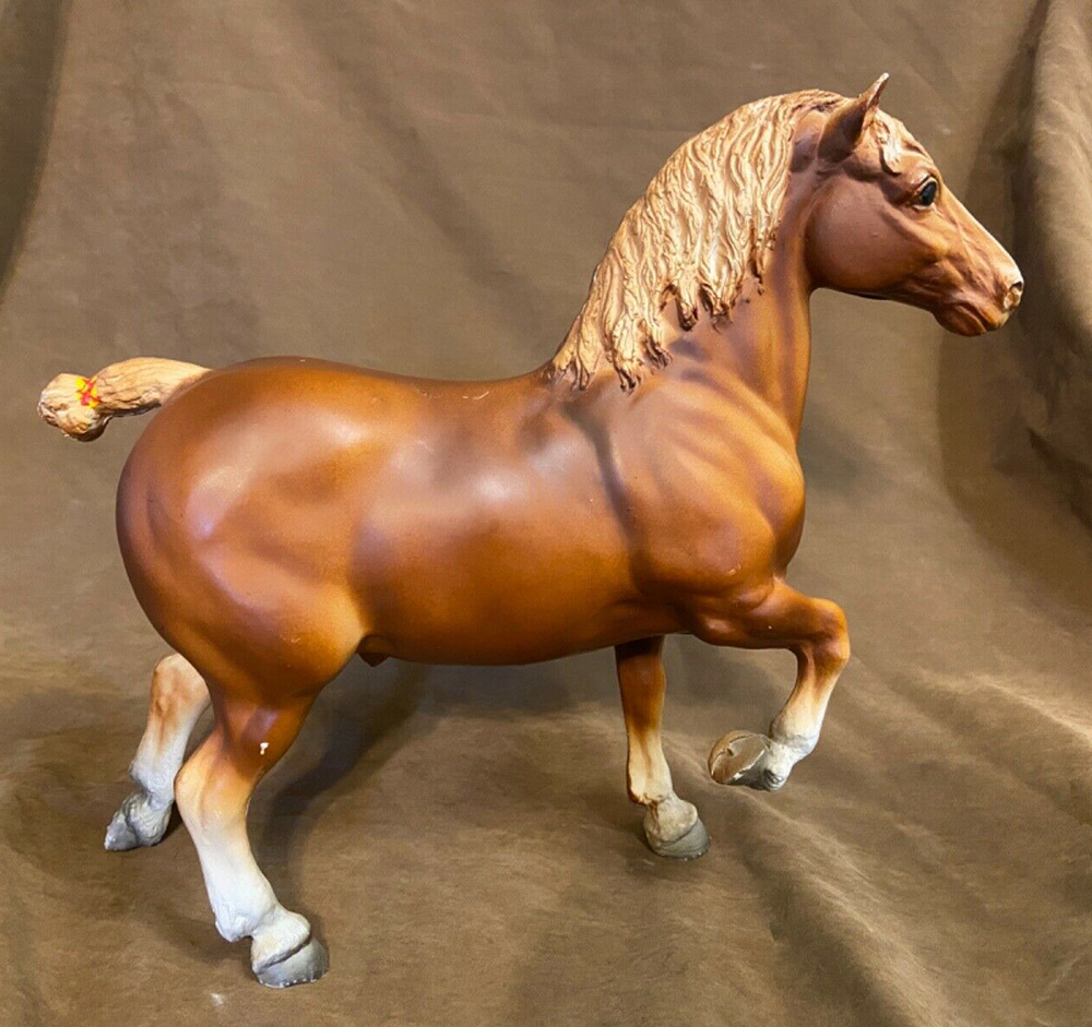 Matte chestnut/sorrel; flaxen mane and tail; bald face; 4 stockings; red on yellow tail ribbon