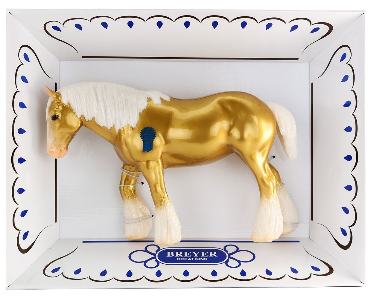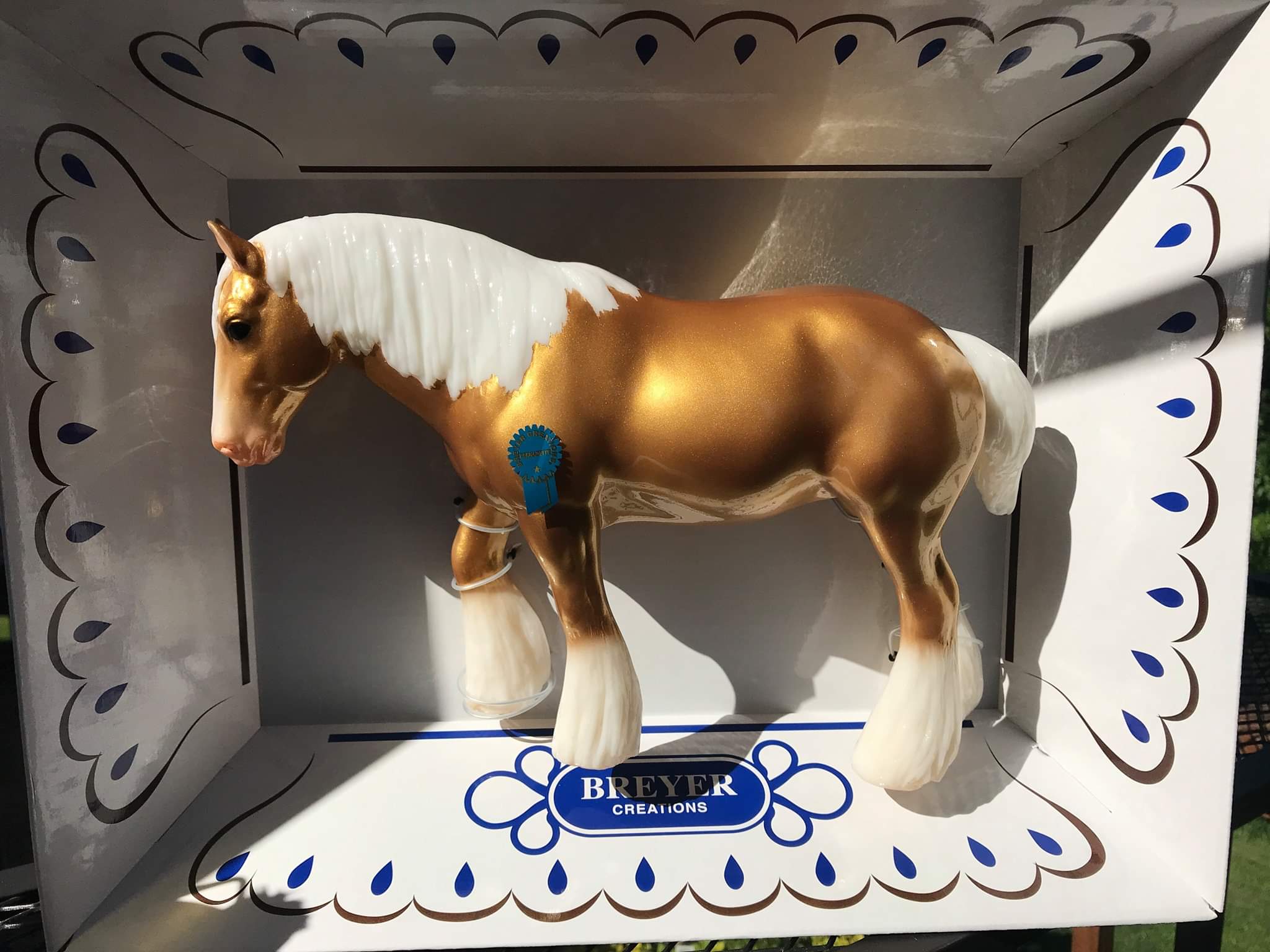 Glossy gold charm, bald face, white mane and tail, 4 socks, blue ribbon sticker, Vintage Club SR