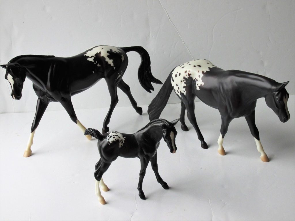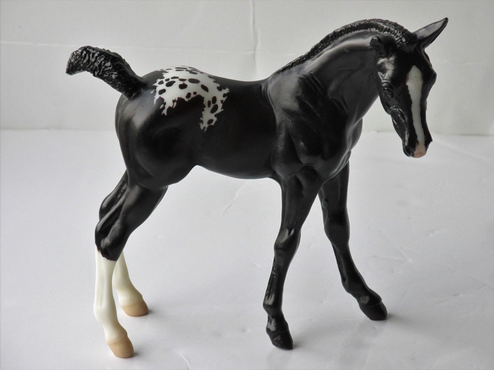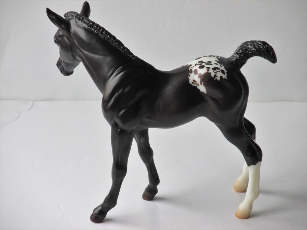 Matte black appaloosa; stenciled pattern; stripe-snip; 2 hind socks; JCPenney SR – with Zippo and Strapless