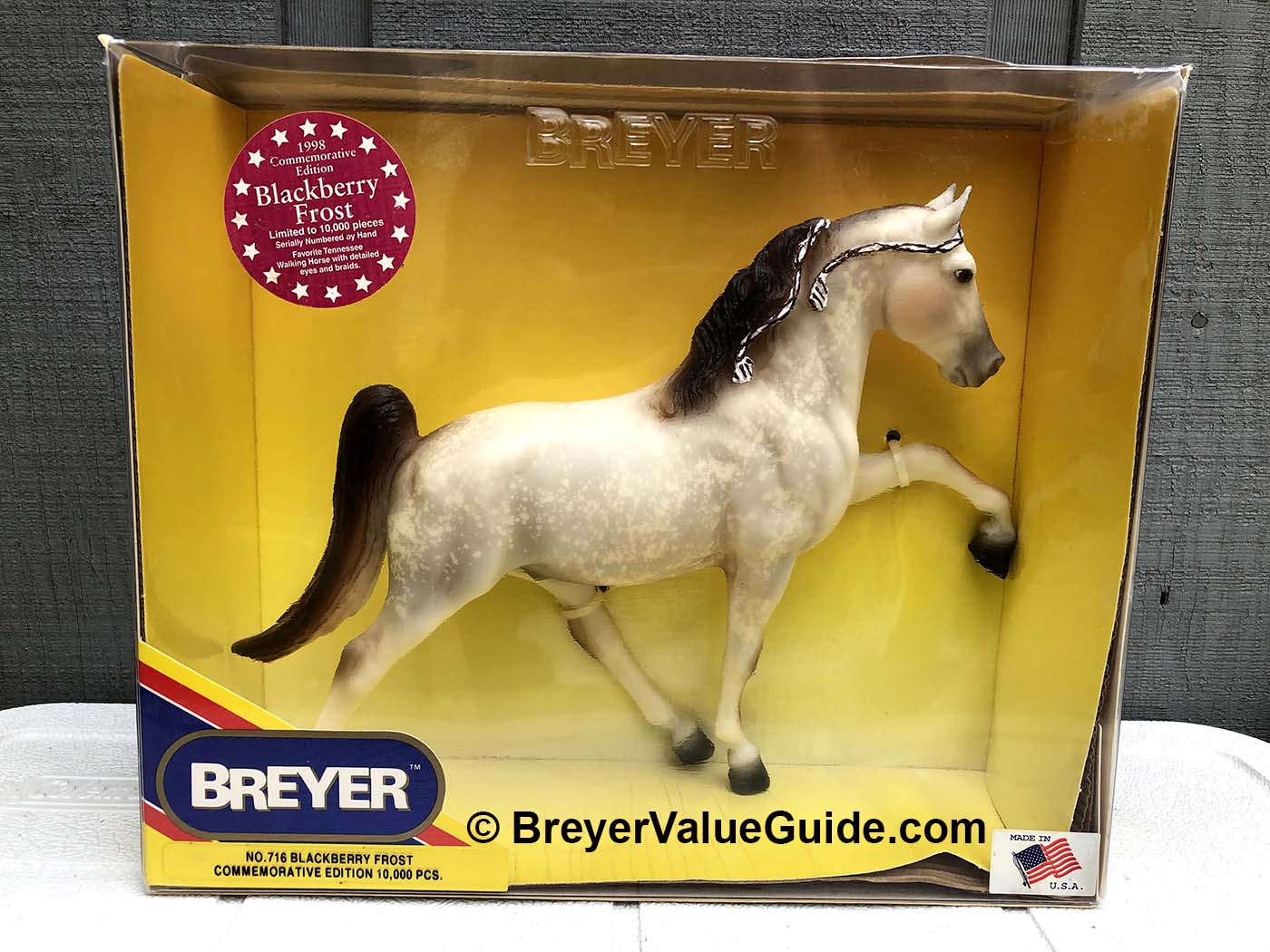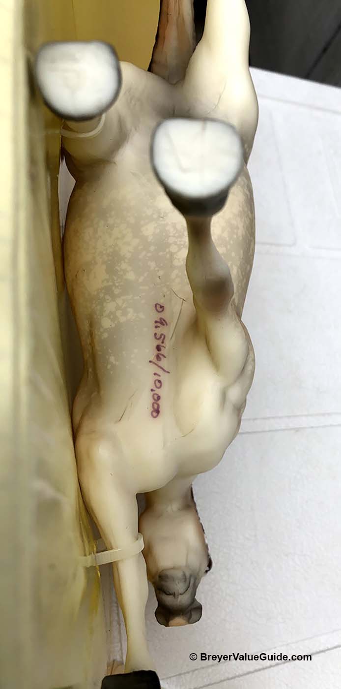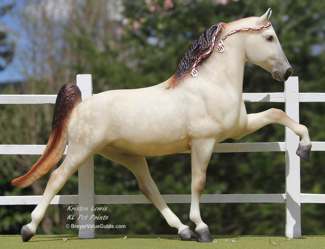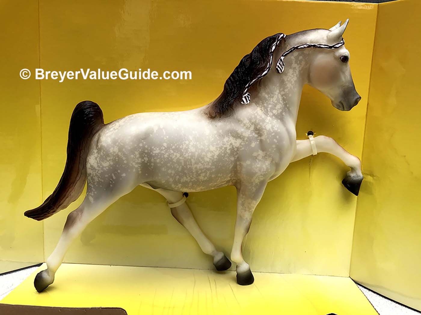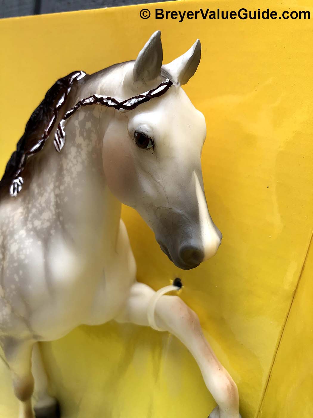 Matte light dapple grey; resist dapples; darker mane and tail; snip; dark red on white ribbons; Commemorative Edition; 1/10000