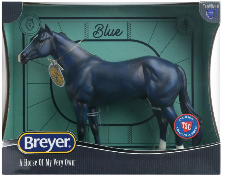 Matte dark blue with “textural patterned coat,” blaze, 2 hind socks, FFA hang tag, Tractor Supply SR