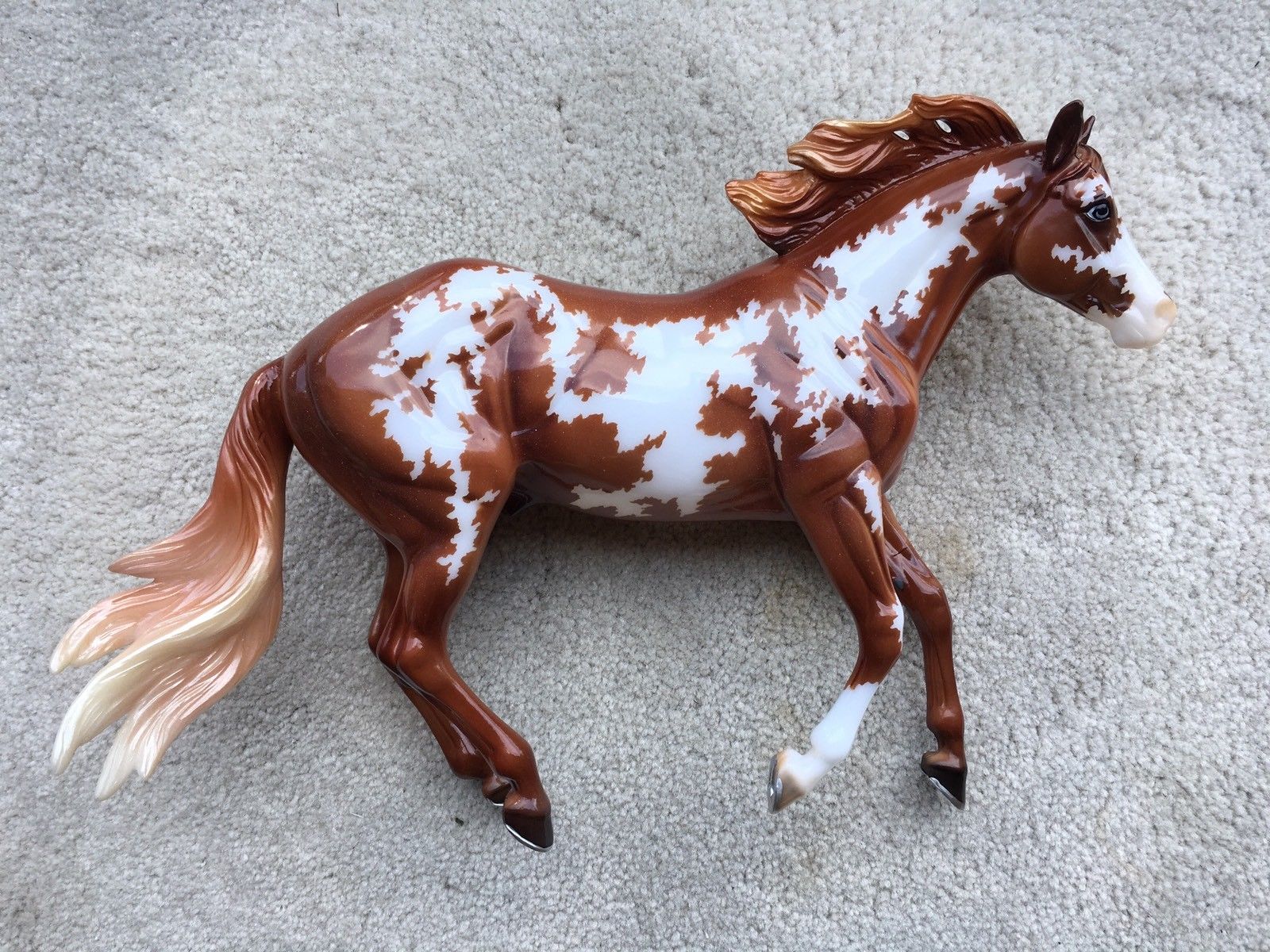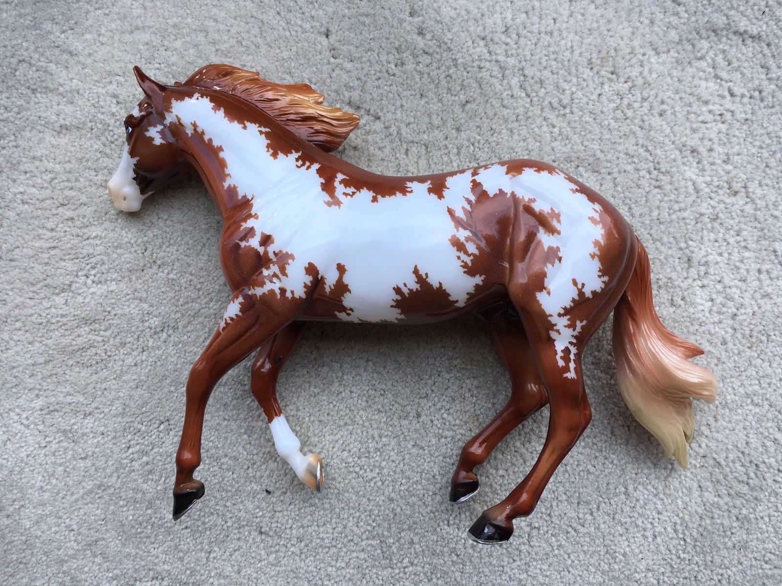 Glossy red chestnut; intricate pinto pattern; roaning; bald face; 1 front stocking; painted shoes; BreyerFest SR; 1/175 glossy