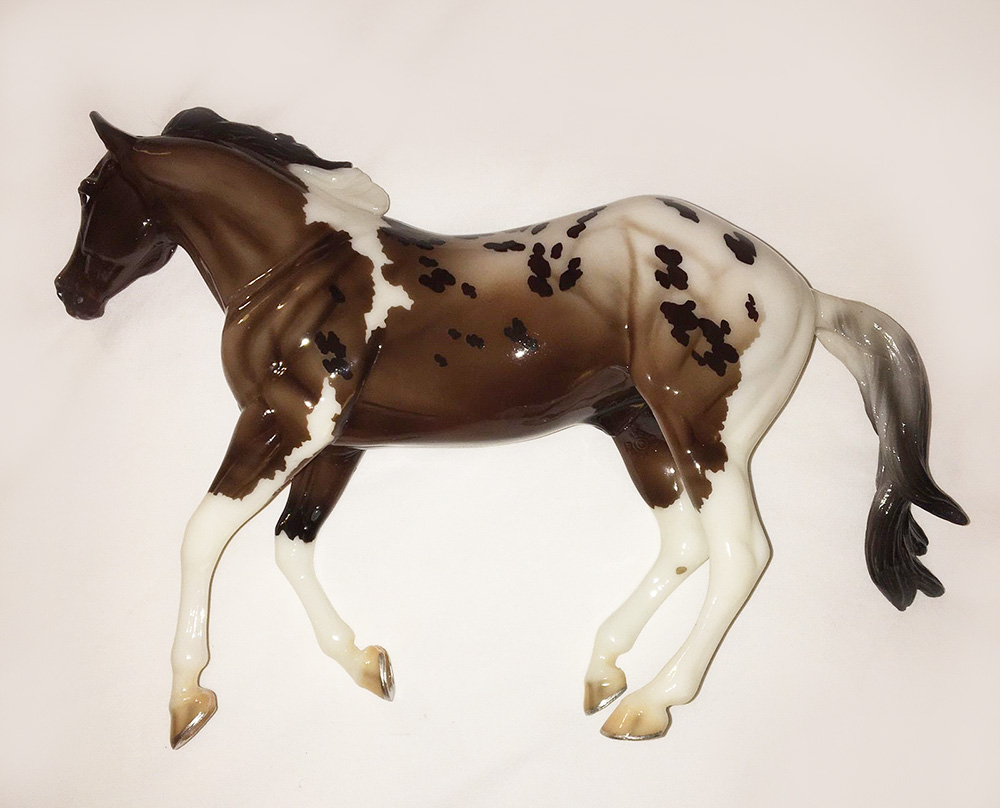 Glossy dark bay pintaloosa; dark brown spots; star; white legs; striped hooves with painted shoes; BreyerFest SR; 1/175 glossy