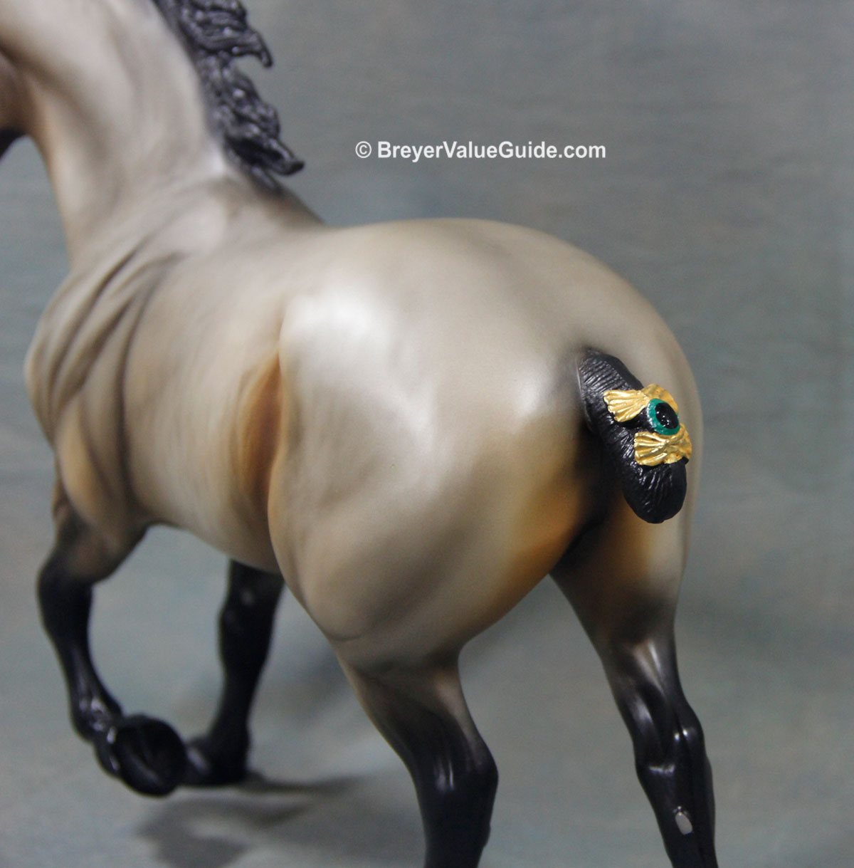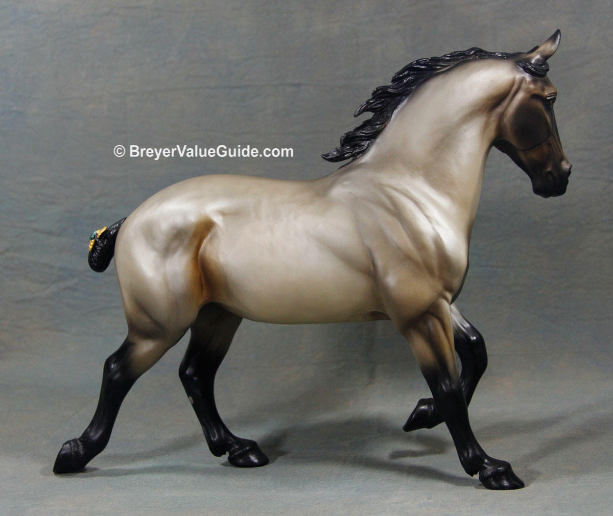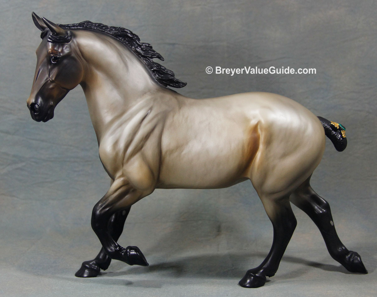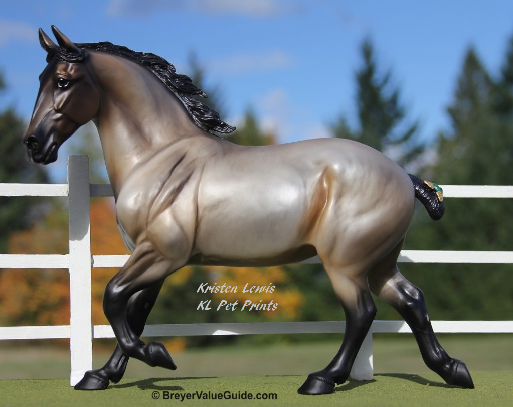Matte bay roan; black mane and tail; black legs and hooves; green and gold tail ribbons; Mid States SR