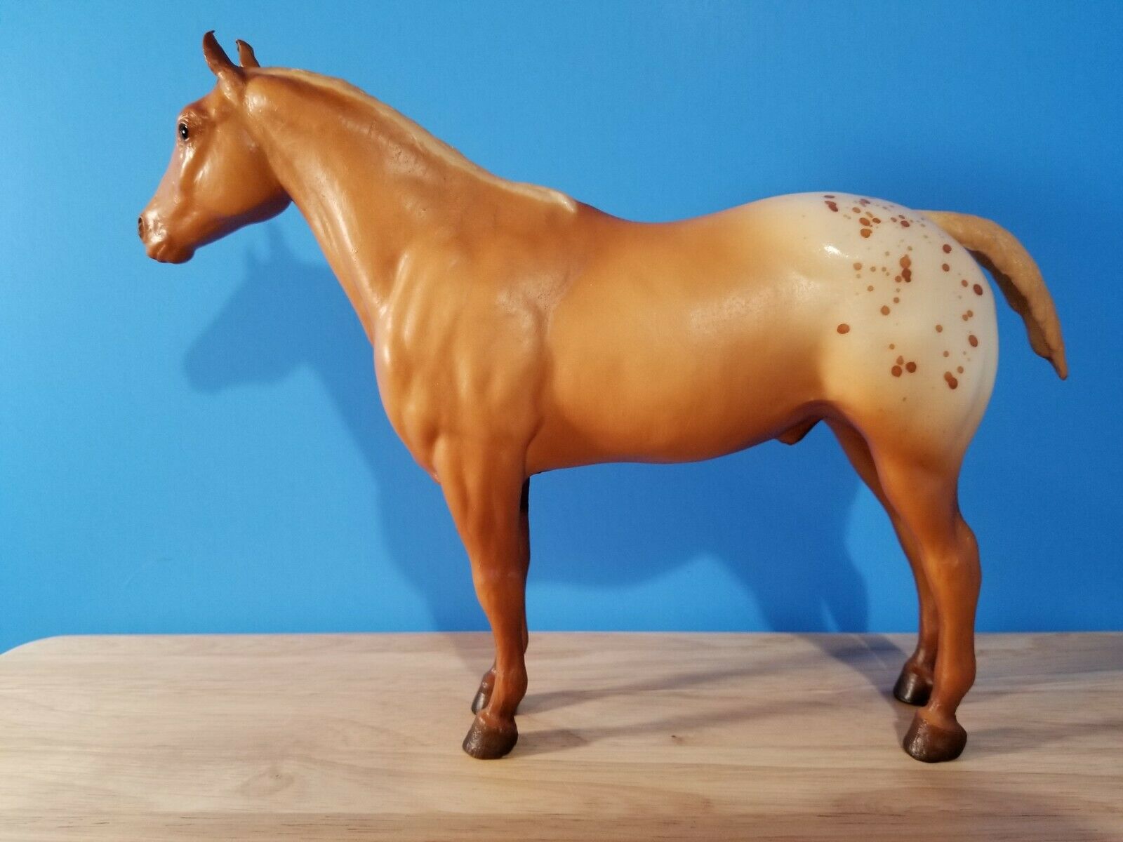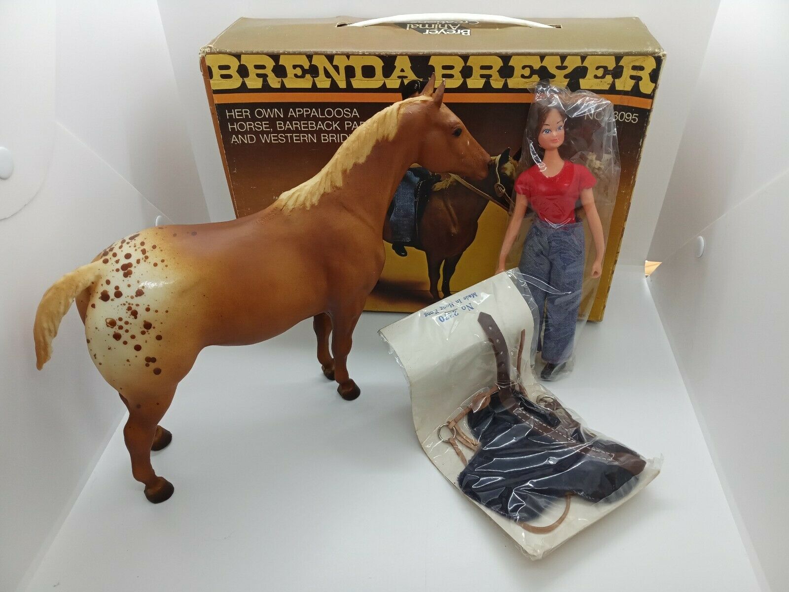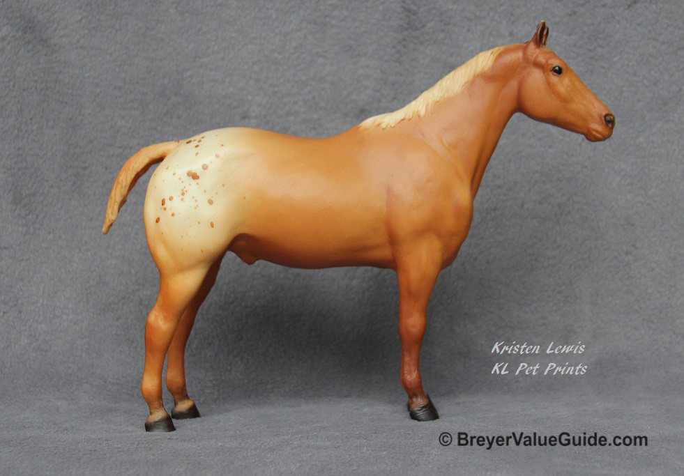 Matte sorrel blanket appaloosa with splatter spots; flaxen mane and tail; solid face – with tack and Brenda Breyer doll