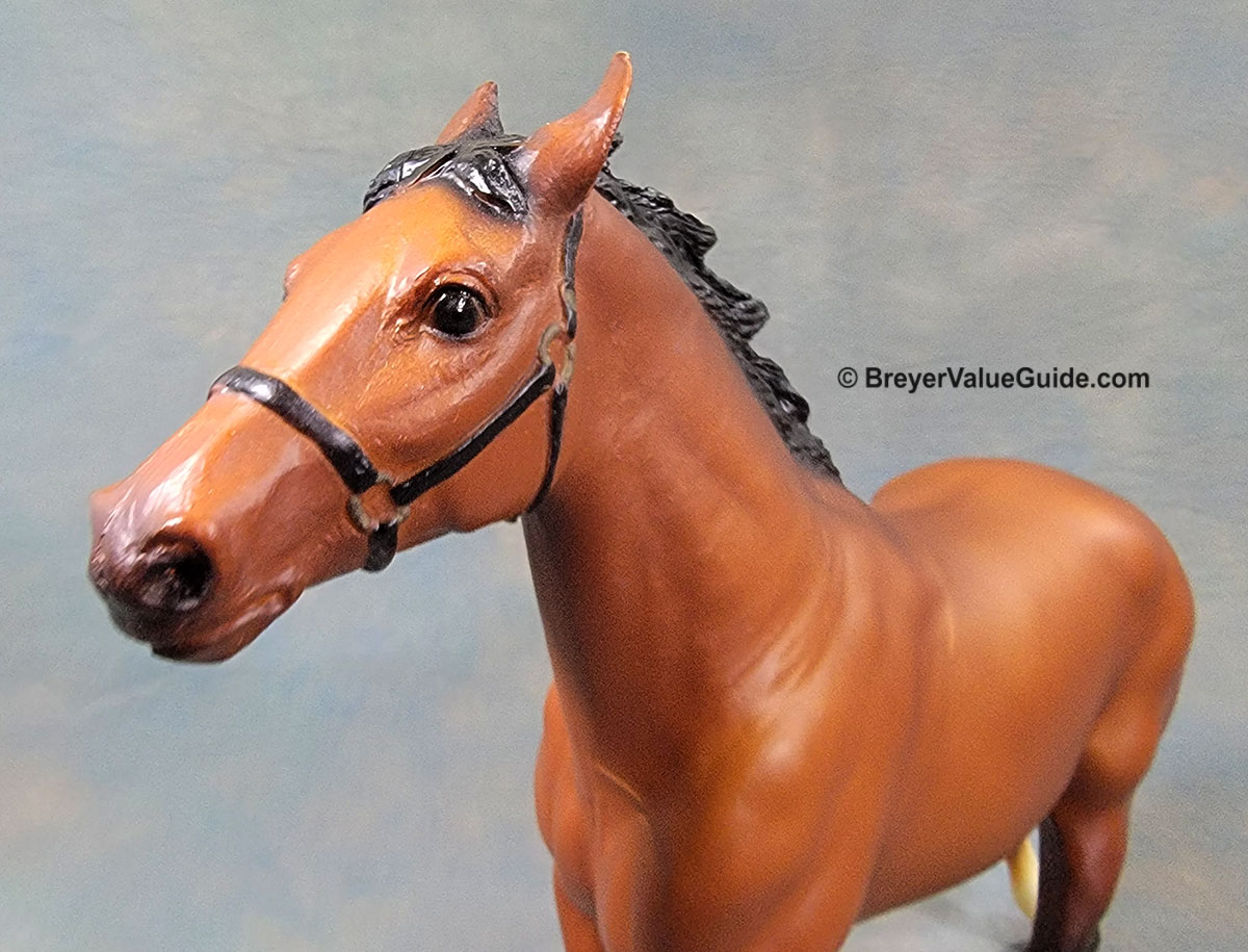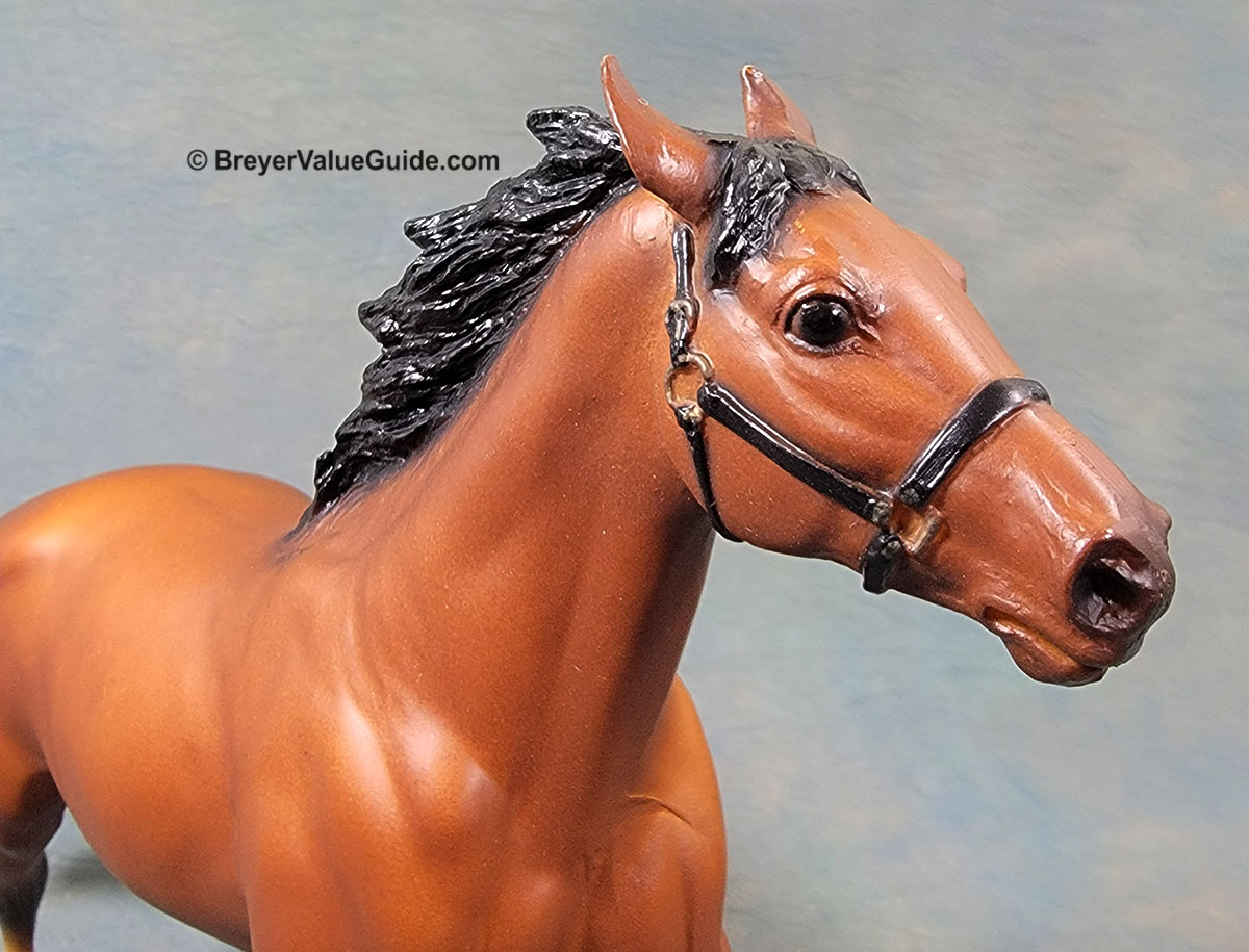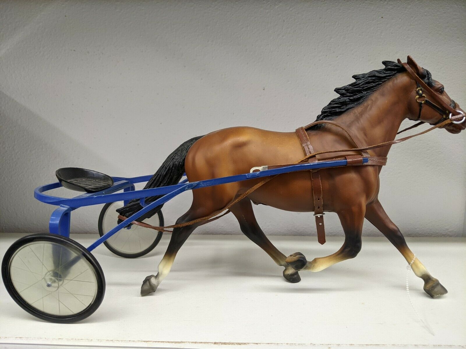 Matte medium to light bay; black points; solid face; 4 socks; brown halter – with Brenda doll; plastic sulky; leather racing harness; Sears SR. Value for complete set.