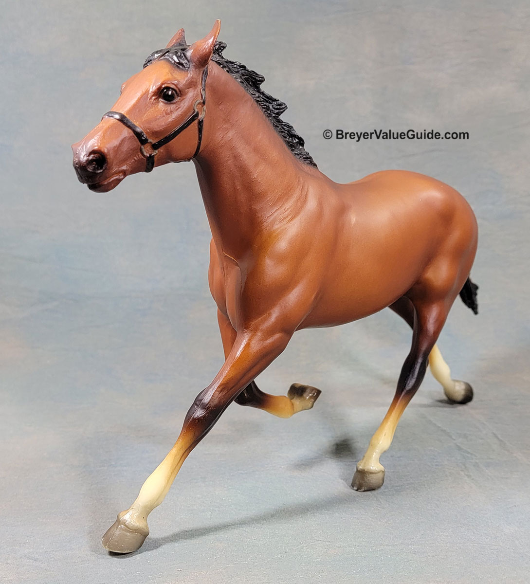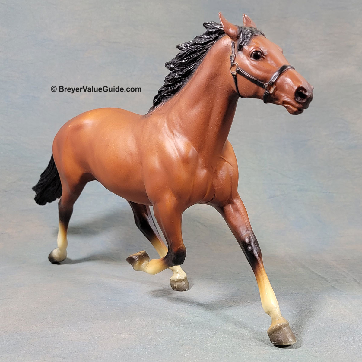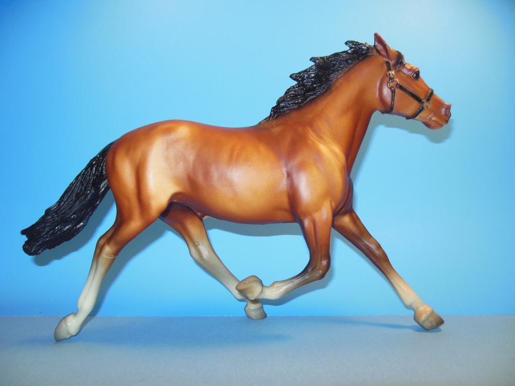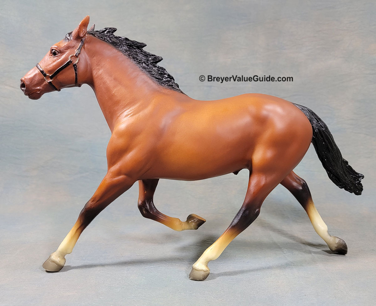Matte medium to light bay; black points; solid face; 4 socks; brown halter – with Brenda doll; plastic sulky; leather racing harness; Sears SR. Value for complete set.
