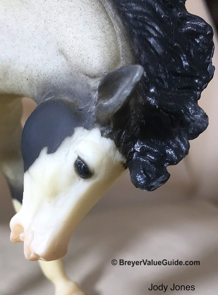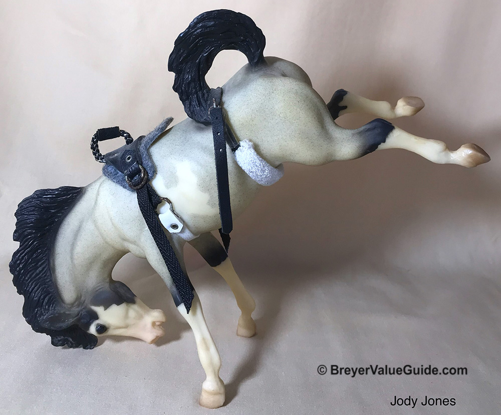 Matte blue roan pinto; stenciled bald face; 4 stockings; includes bareback rodeo tack