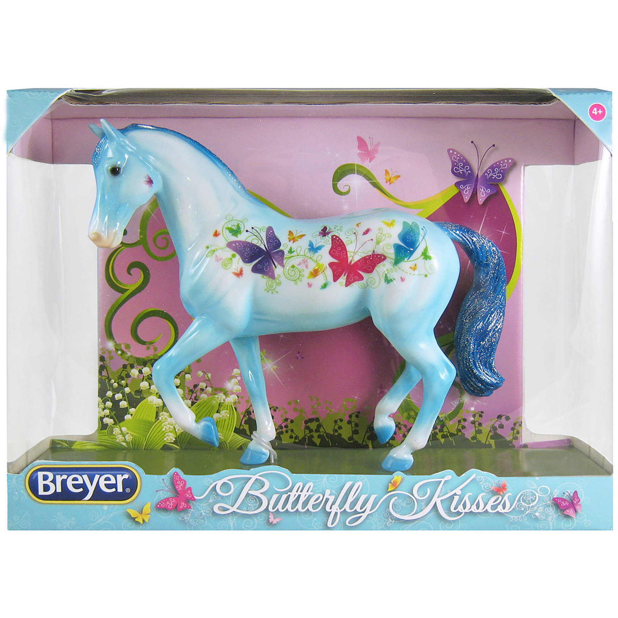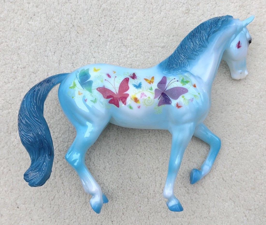 Glossy decorator light blue with butterflies and flowers on body; darker blue mane and tail