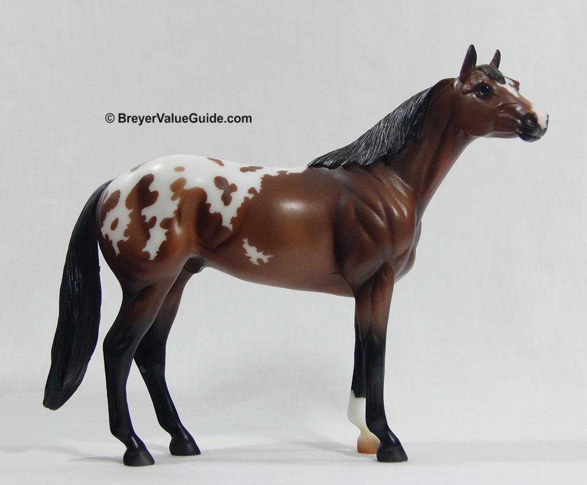 Matte bay appaloosa; broken blaze with snip; 1 front sock; striped hoof – Web SR; 1/500