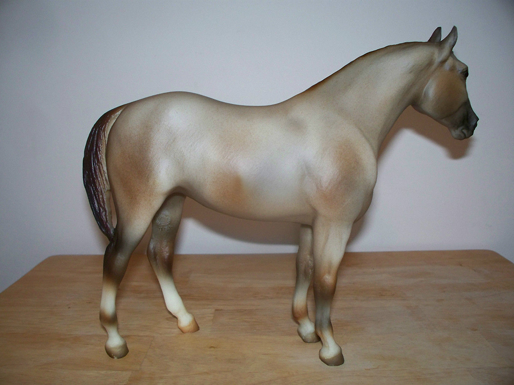 Matte dun; narrow blaze; red shaded points; 1 hind sock