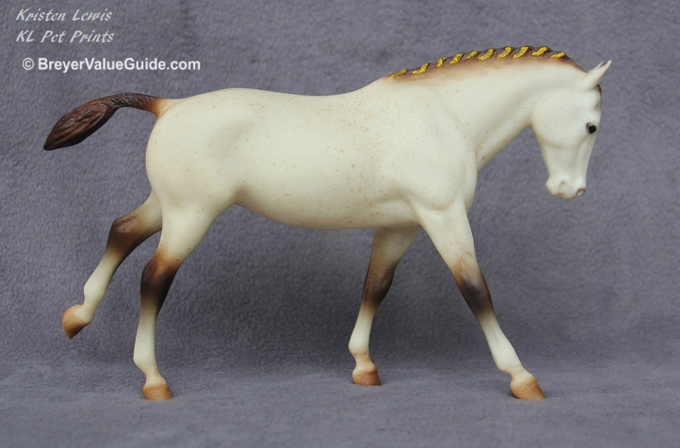 Matte red roan; brown points; 4 socks; tan hooves; yellow mane ribbons; Small World SR; 1/500