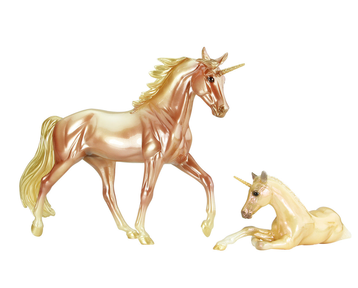 Mare – “Ceres has a blush glossy metallic coat with pink and gold shading.” Foal – “Minerva is a golden palomino with pink interference.” Both have gold horns and hooves, Limited Edition Valued as set. Issue price: $75