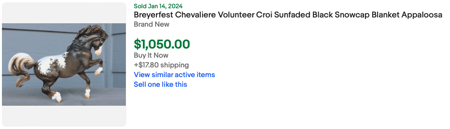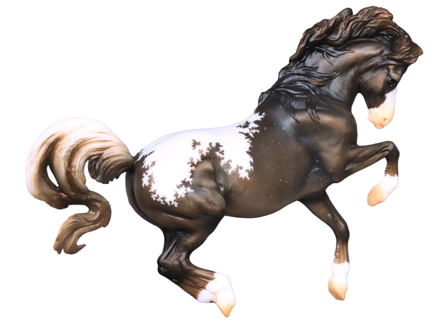Matte sunfaded black appaloosa, wide blaze over muzzle, 1 blue eye, 1 brown eye, 4 socks, BreyerFest 2023 belly stamp
