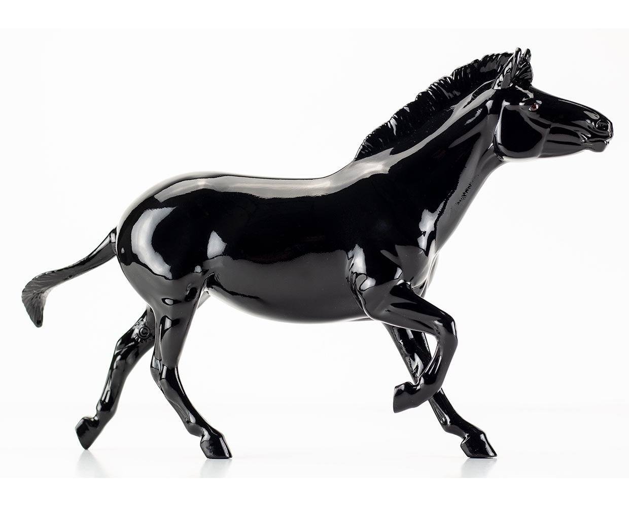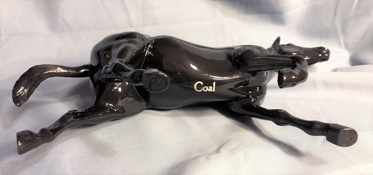 “Each candy cane-inspired zebra has a pearly basecoat and one of the following stripe colors: candied red, satin green, metallic gold, or shimmery blue. Be advised! Those with their names found on the naughty list may receive one of 12 pieces of licorice “coal”: a high gloss solid black zebra with a silver “Coal” pad print on the belly.” – www.breyerhorses.com