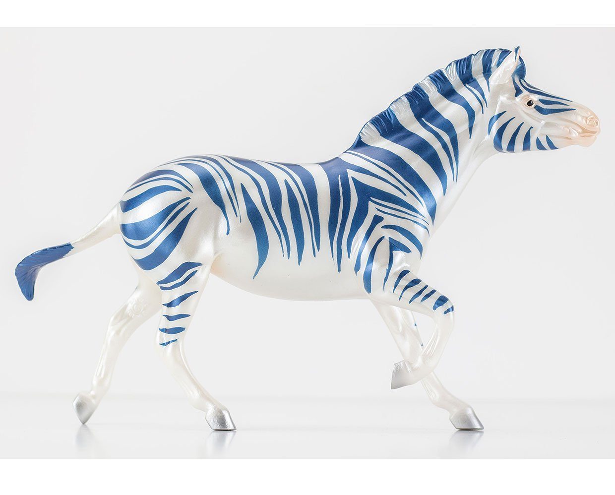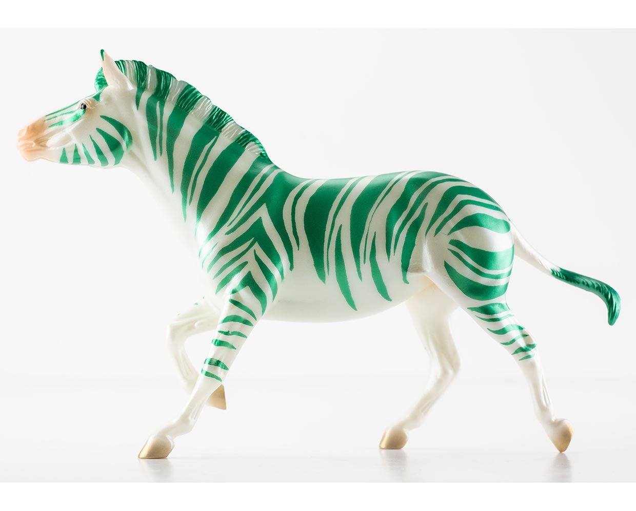 “Each candy cane-inspired zebra has a pearly basecoat and one of the following stripe colors: candied red, satin green, metallic gold, or shimmery blue. Be advised! Those with their names found on the naughty list may receive one of 12 pieces of licorice “coal”: a high gloss solid black zebra with a silver “Coal” pad print on the belly.” – www.breyerhorses.com