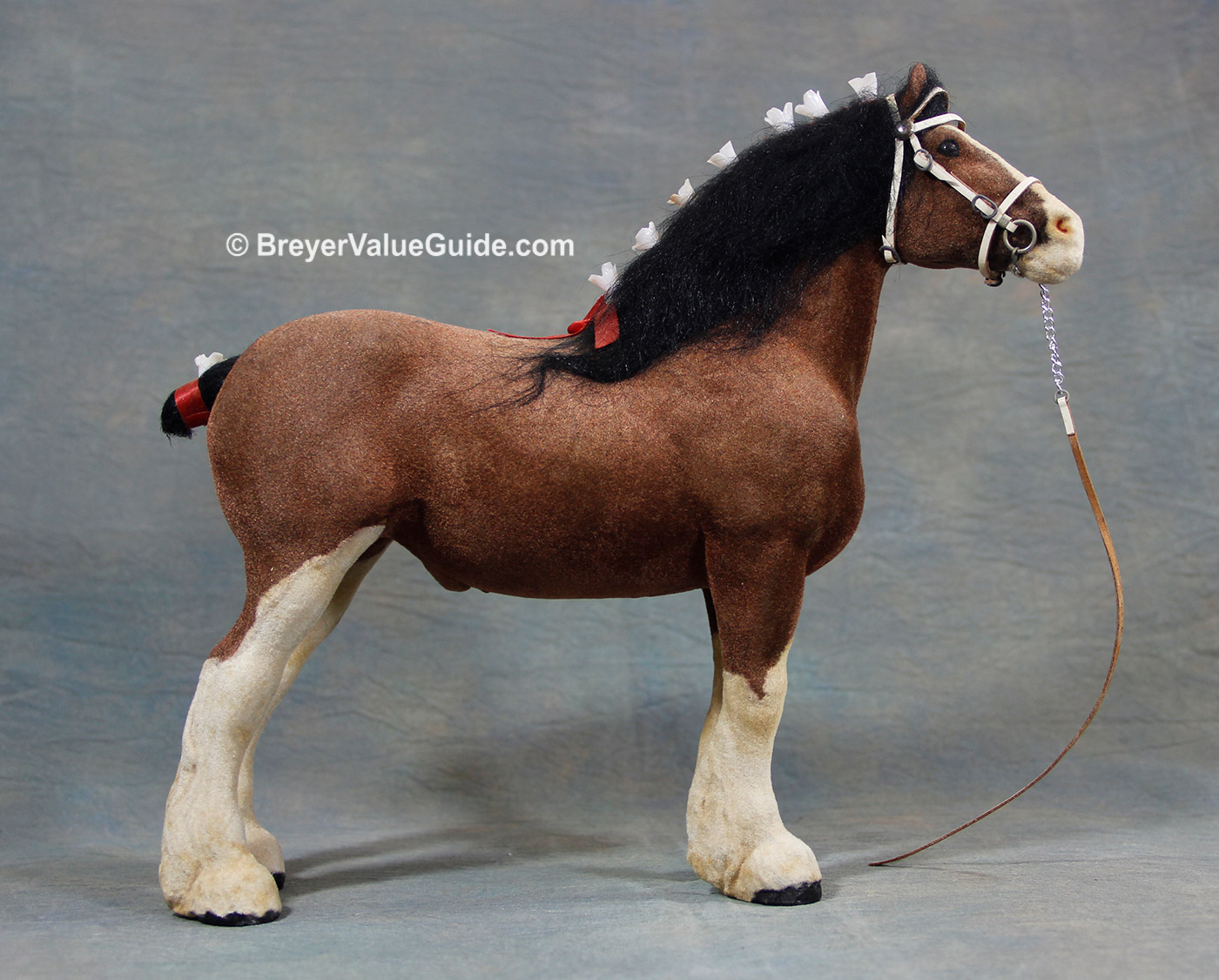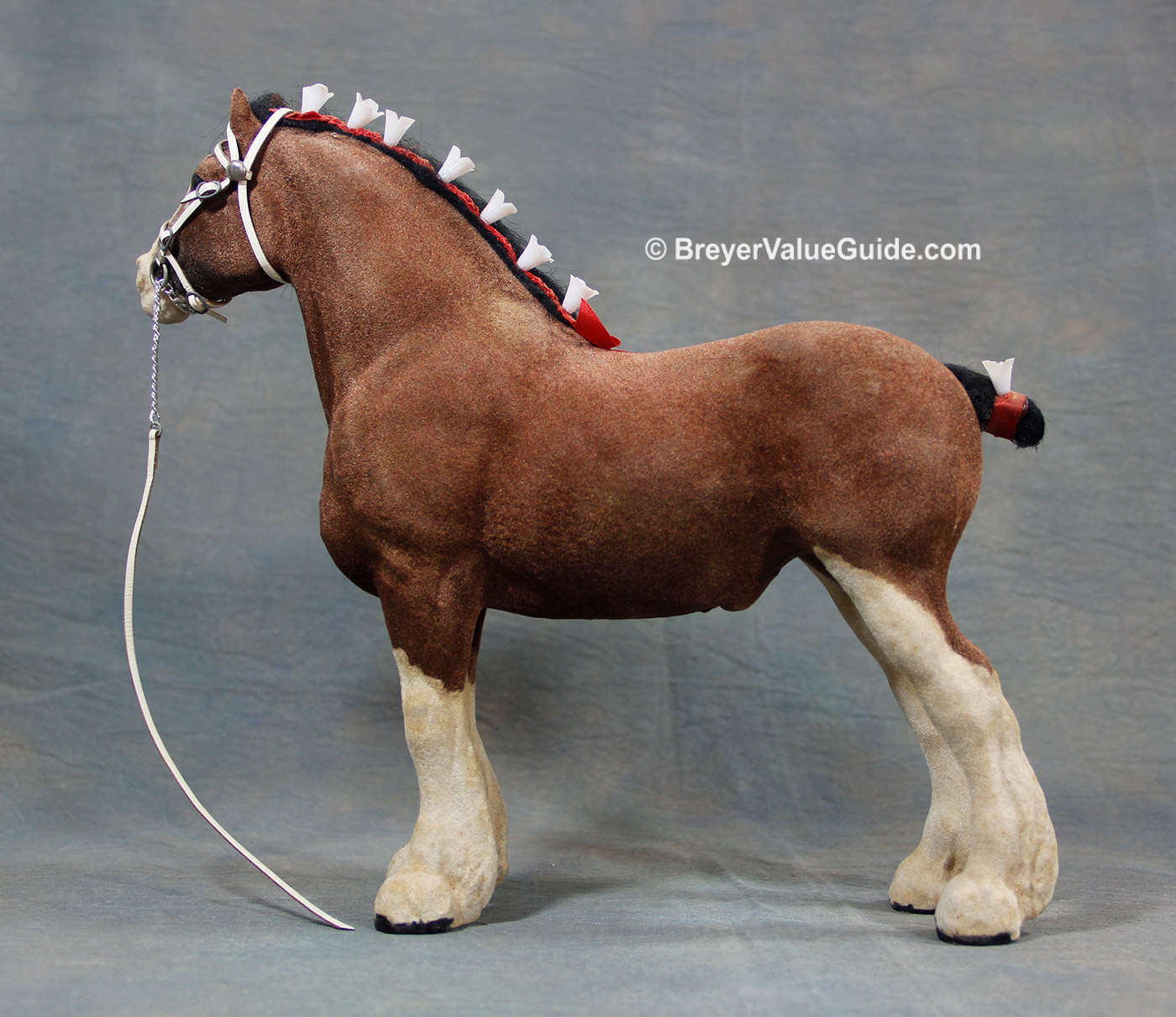 Flocked bay; black mane and tail, gelding parts added, blaze over muzzle, 4 stockings; Sears SR – with white leather halter and lead