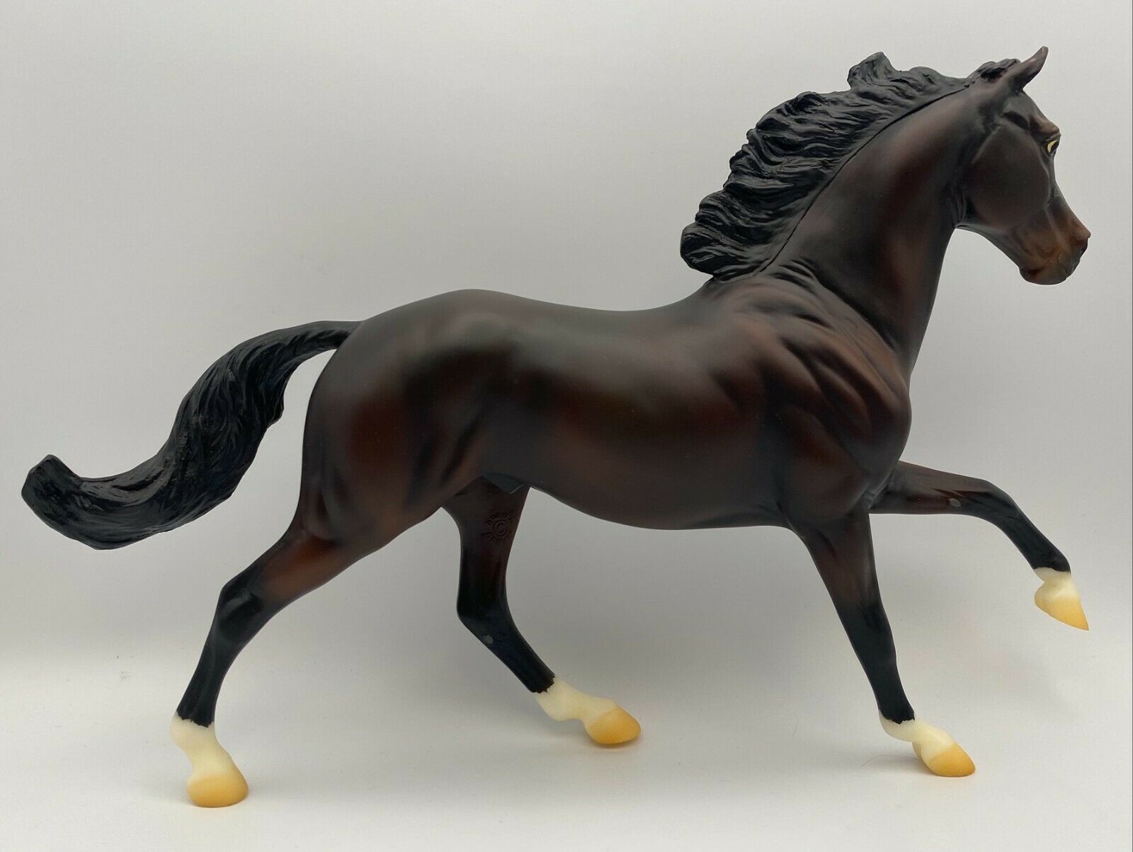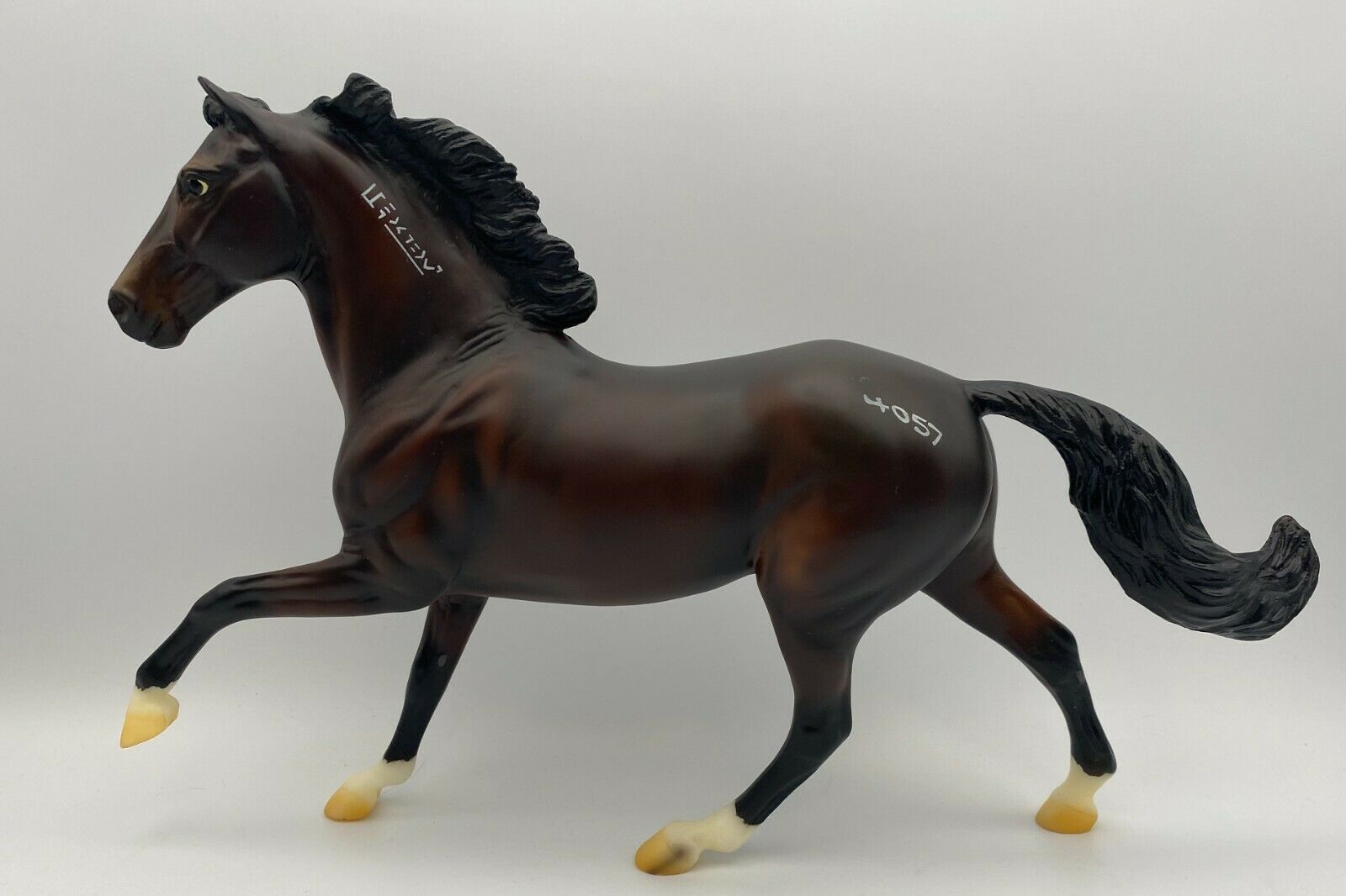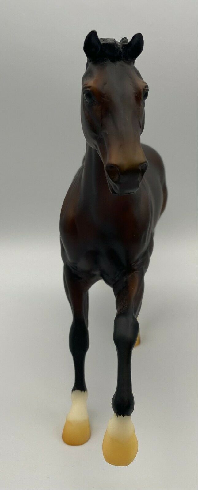 Matte dark bay; 4 low socks; solid face; freeze brand on neck and hip