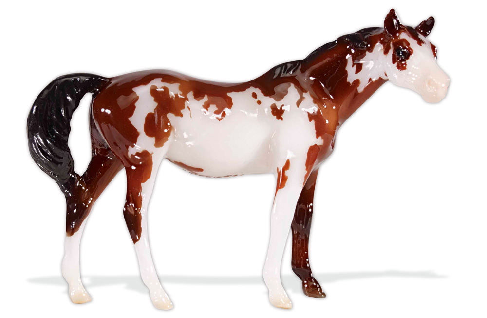Glossy bay pinto; detailed markings; bald face; 3 stockingss; Stablemates Club SR