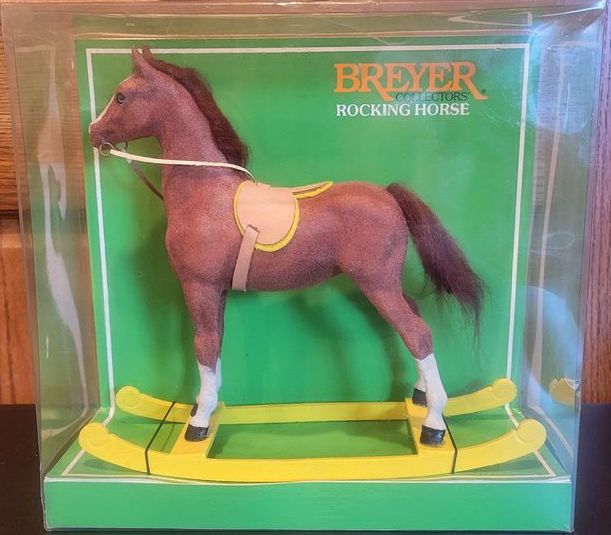 Flocked chestnut; blaze; glass eyes; 4 socks; black hooves – with tack and rockers