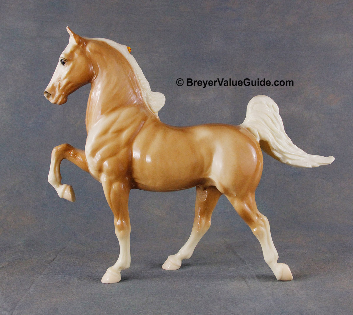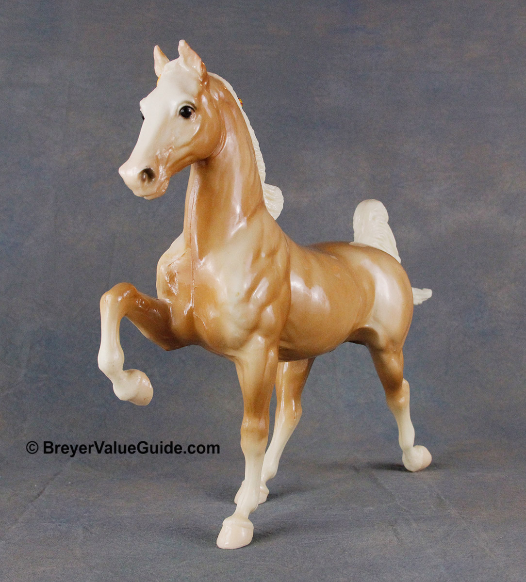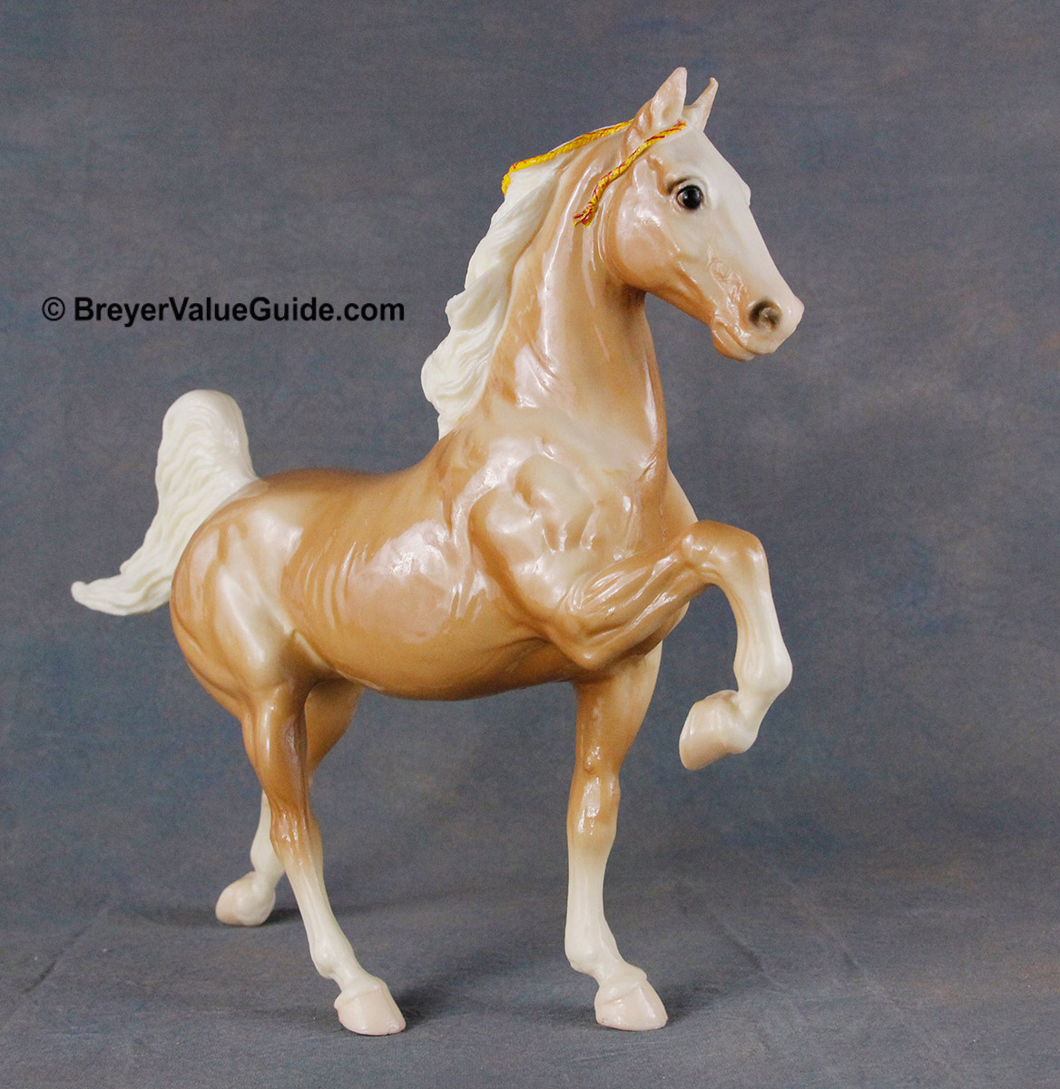 Glossy palomino; bald face; 4 stockings; yellow ribbons with red crisscrosses; pinked hooves