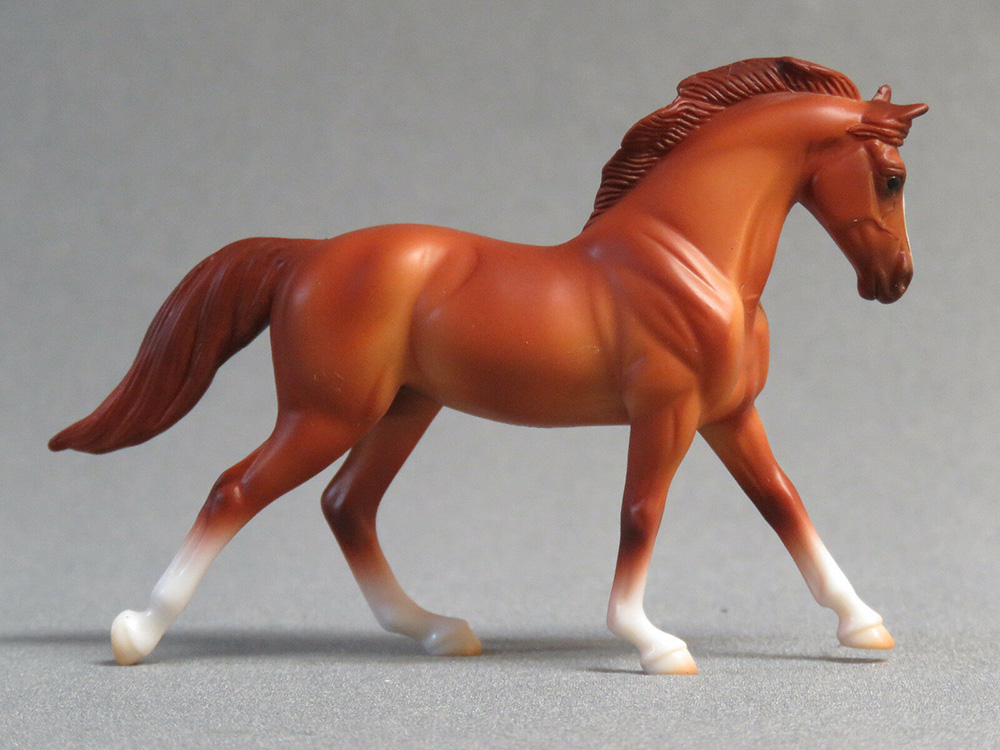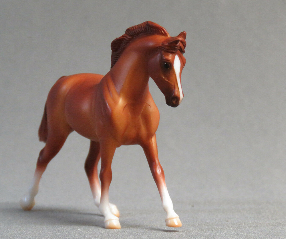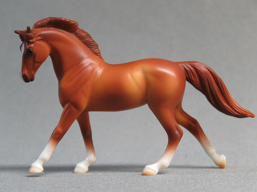 Matte chestnut; blaze; darker mane and tail; 4 socks