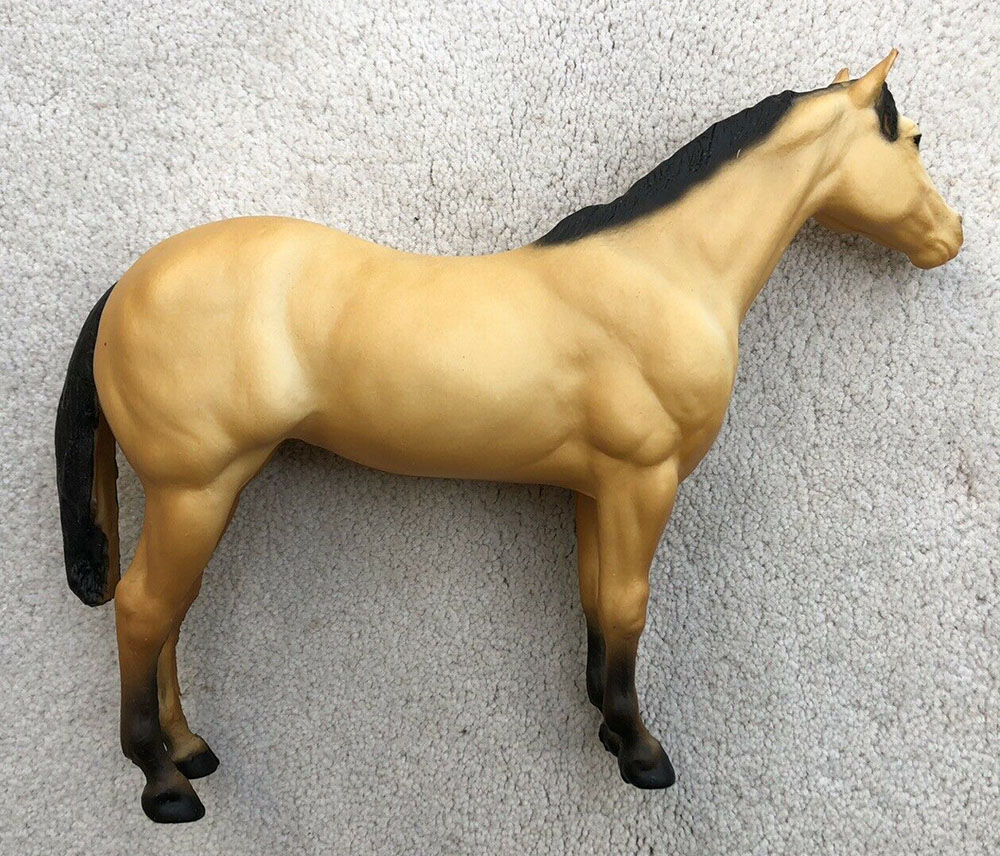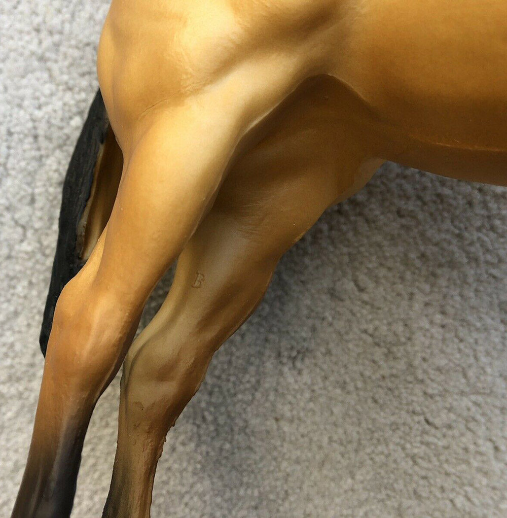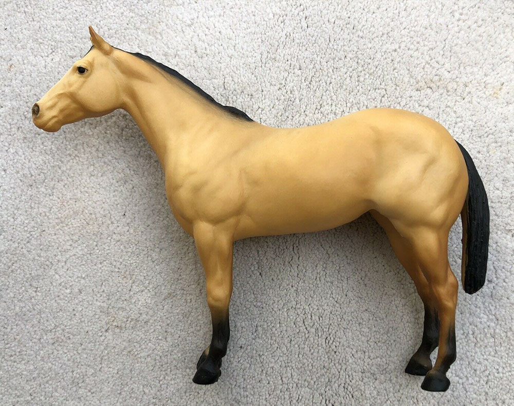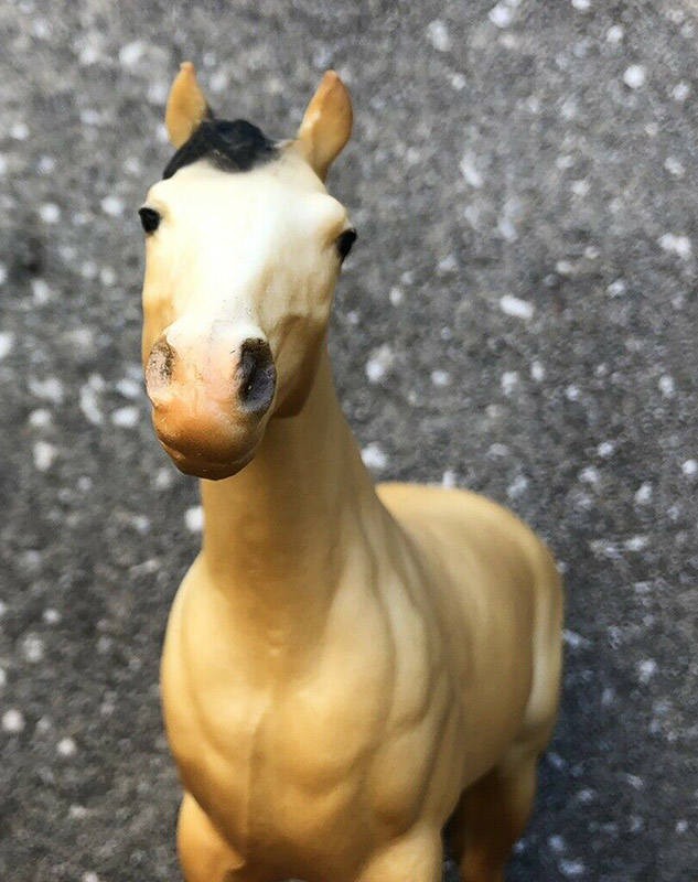 Matte buckskin; bald face with pink nose; black points; “B” stamp on inside back leg; Model Horse Congress SR; 1/244