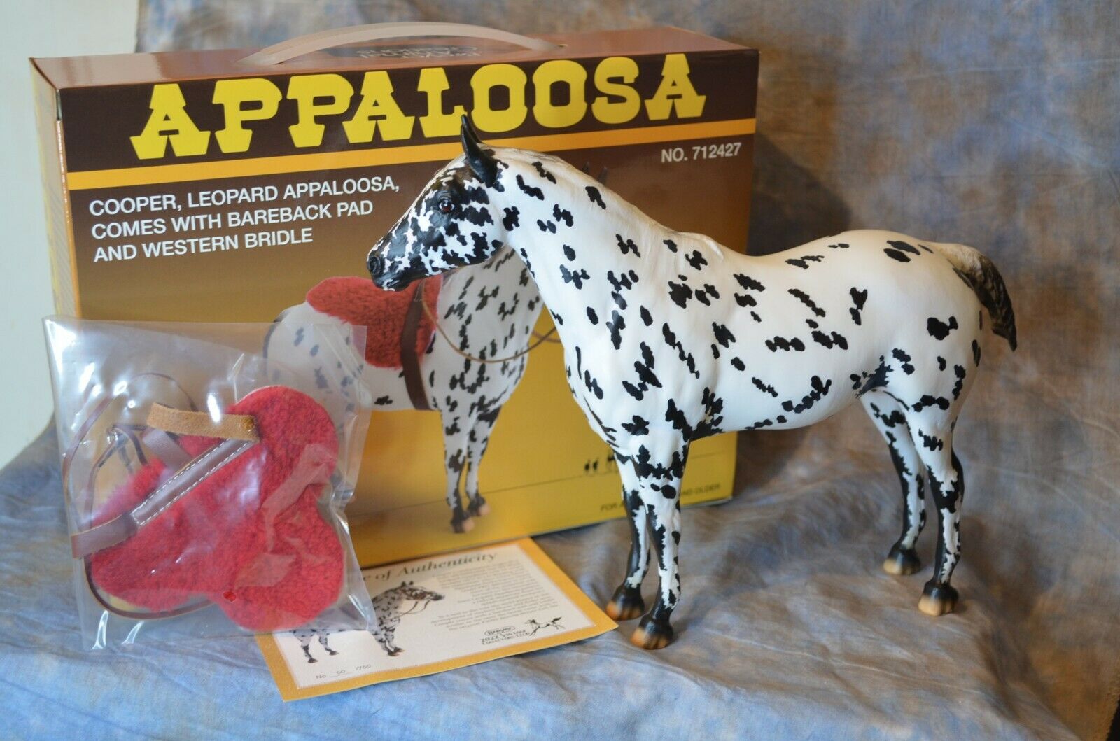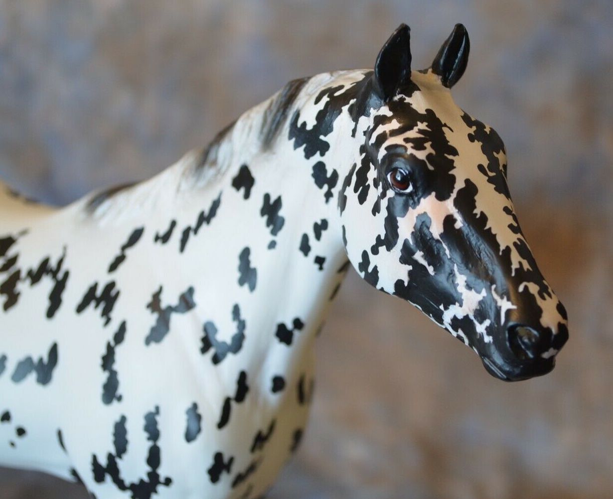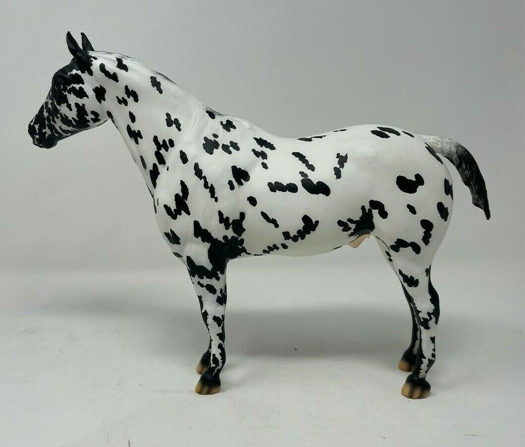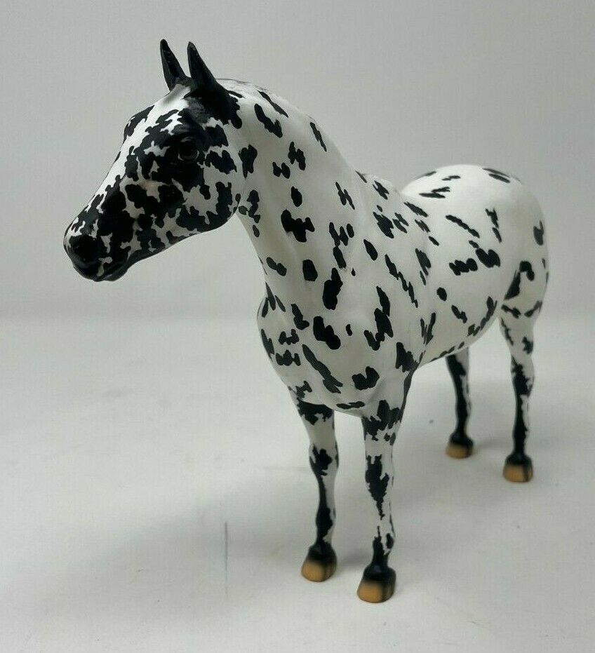 Matte black leopard appaloosa, base coat white with stenciled black spots, striped hooves, includes red bareback pad with bridle, full color carry box, Vintage Club SR, 1/750