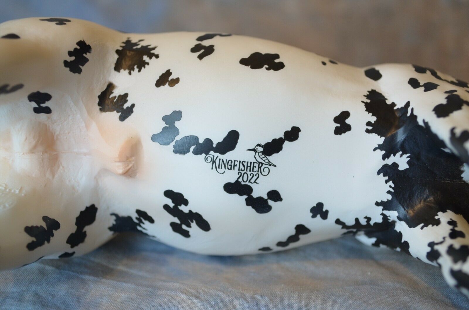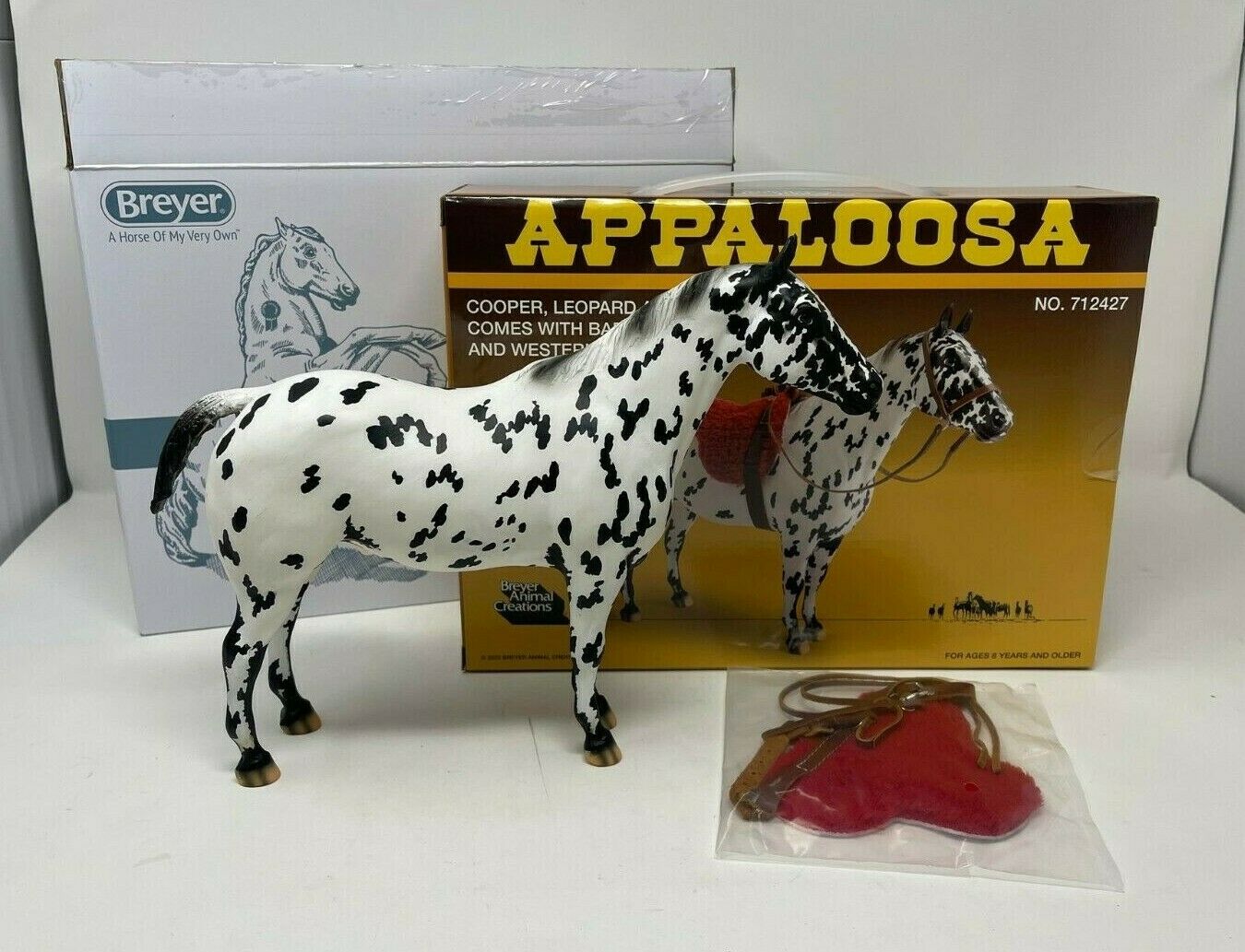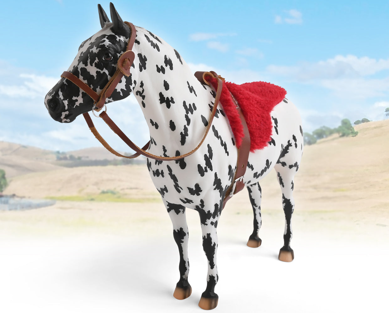 Matte black leopard appaloosa, base coat white with stenciled black spots, striped hooves, includes red bareback pad with bridle, full color carry box, Vintage Club SR, 1/750