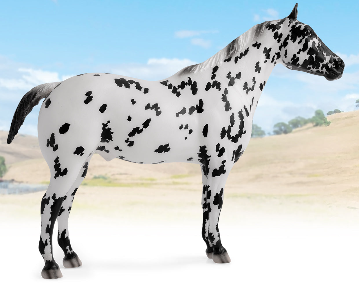 Matte black leopard appaloosa, base coat white with stenciled black spots, striped hooves, includes red bareback pad with bridle, full color carry box, Vintage Club SR, 1/750