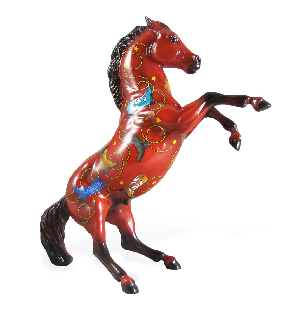 Glossy decorator red bay with western cowboy boots decals; dark shaded points – BreyerFest SR; 1/500