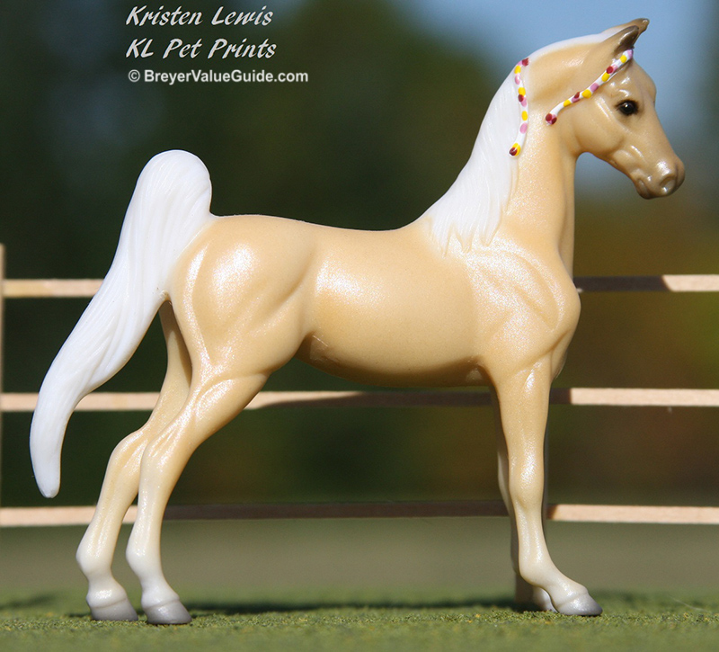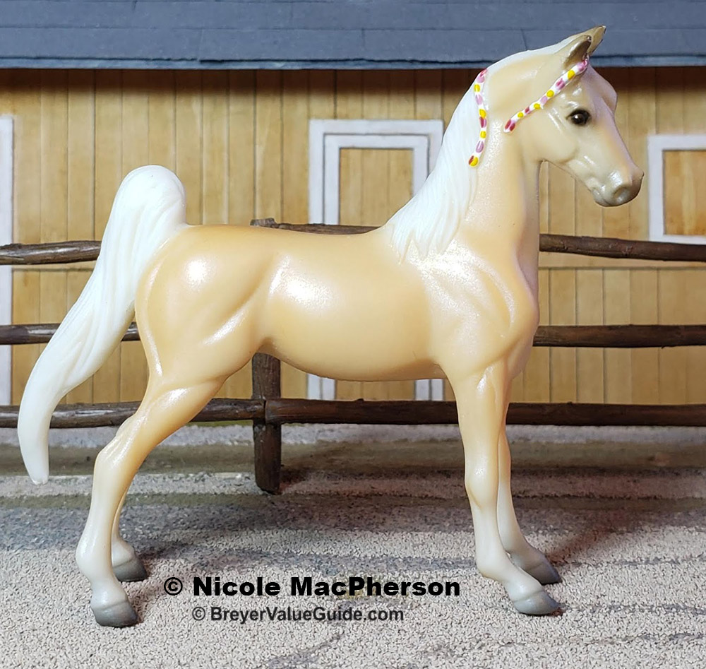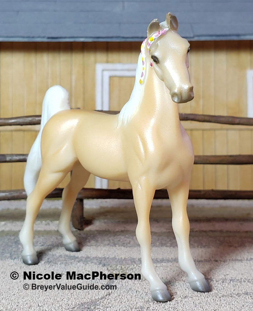 Matte light palomino; white mane and tail, solid face, 4 socks; grey hooves, pink and yellow on white ribbons