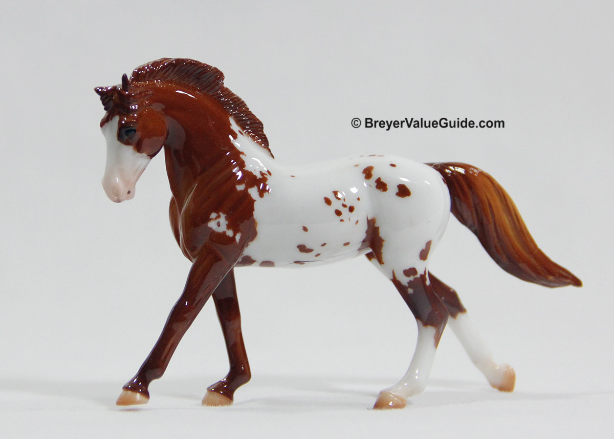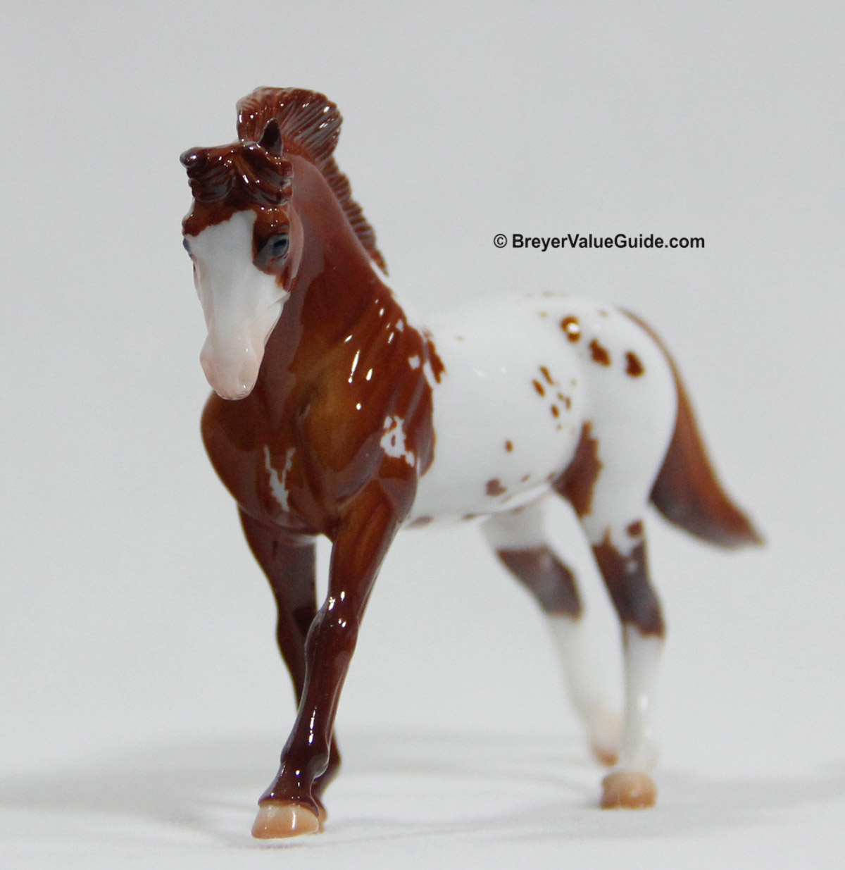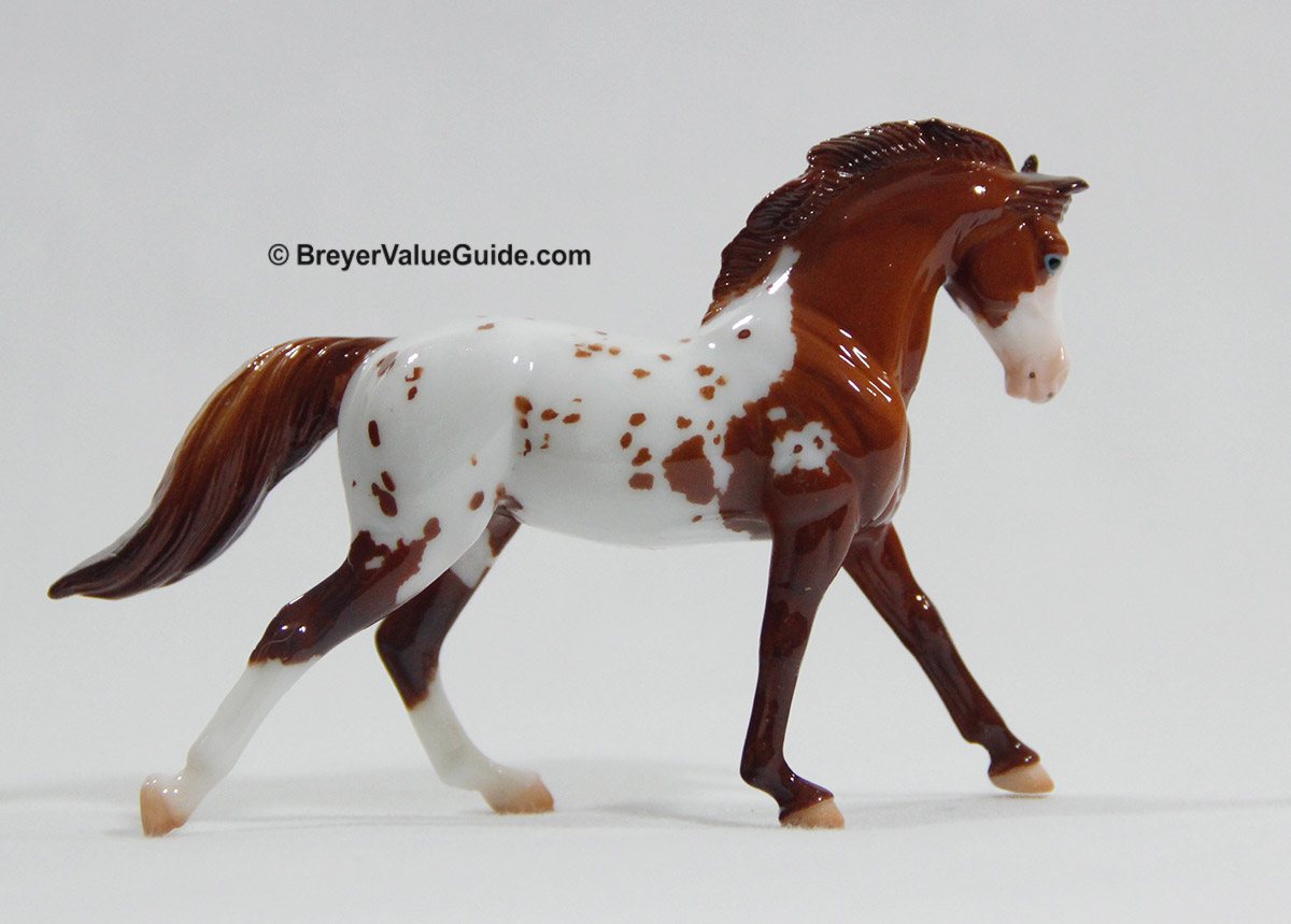 Glossy semi-leopard chestnut appaloosa; wide blaze; 2 hind socks; BreyerFest SR; 1/1500
