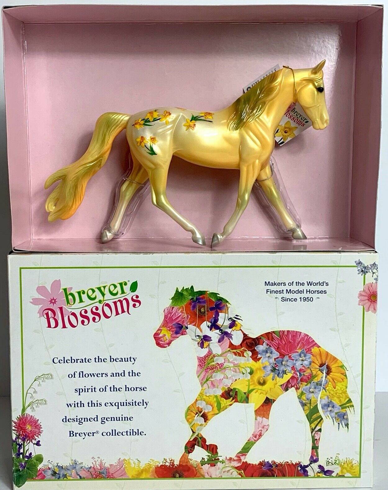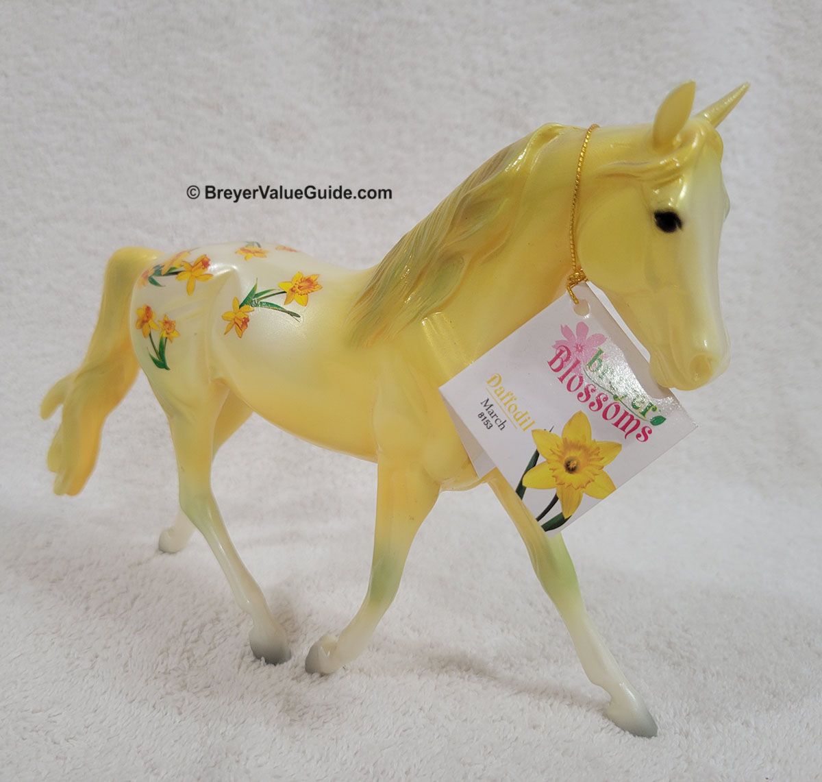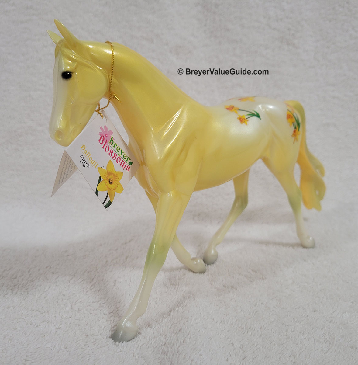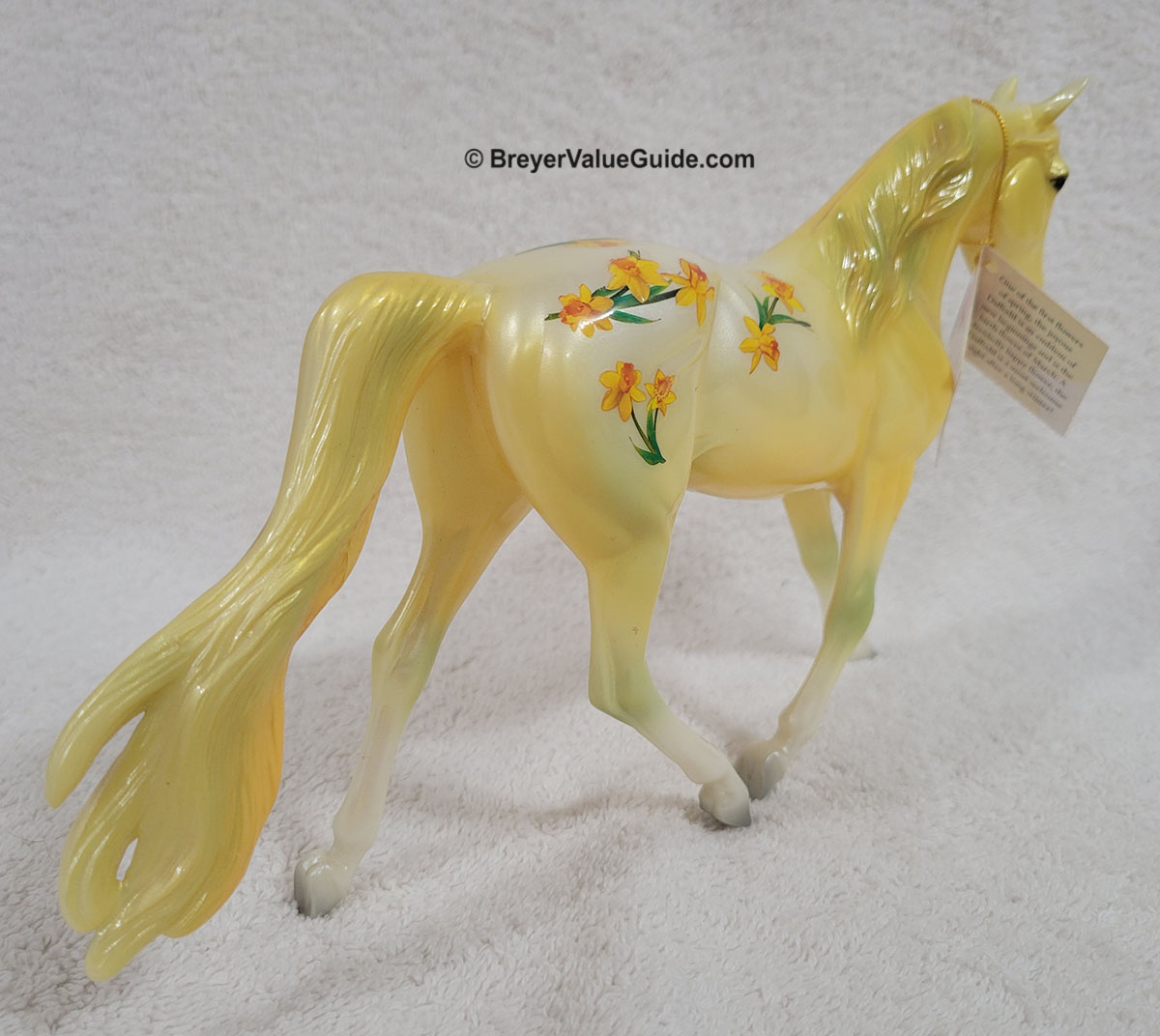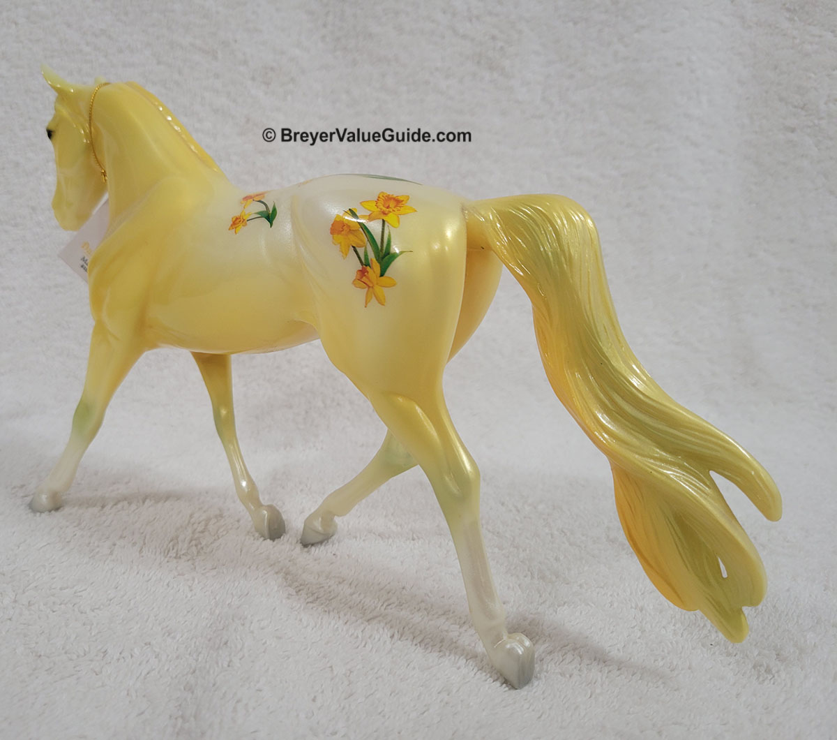Glossy decorator yellow with yellow daffodil graphics; leg shading to silver/lilac hooves; Breyer Blossoms Series
