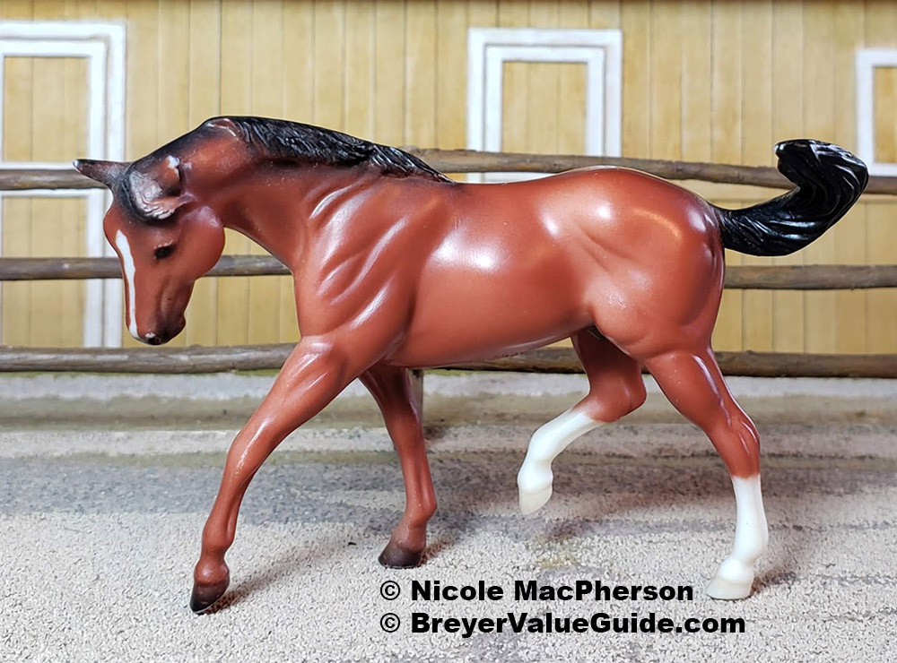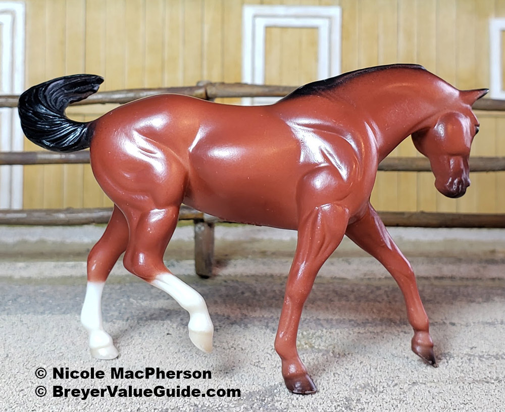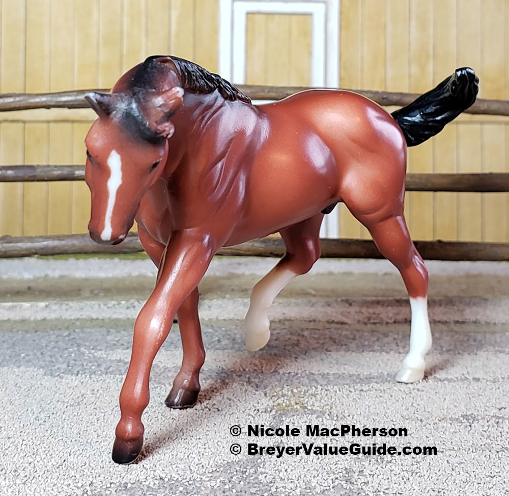 Matte red chestnut; darker mane and tail; stripe; 2 hind socks