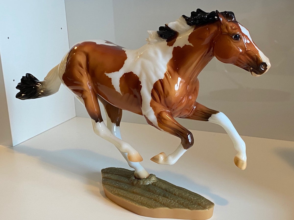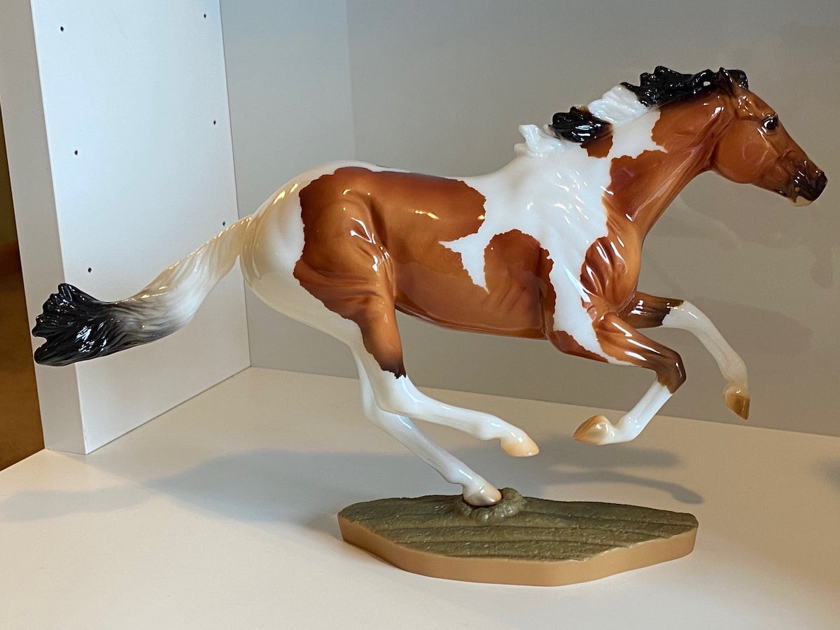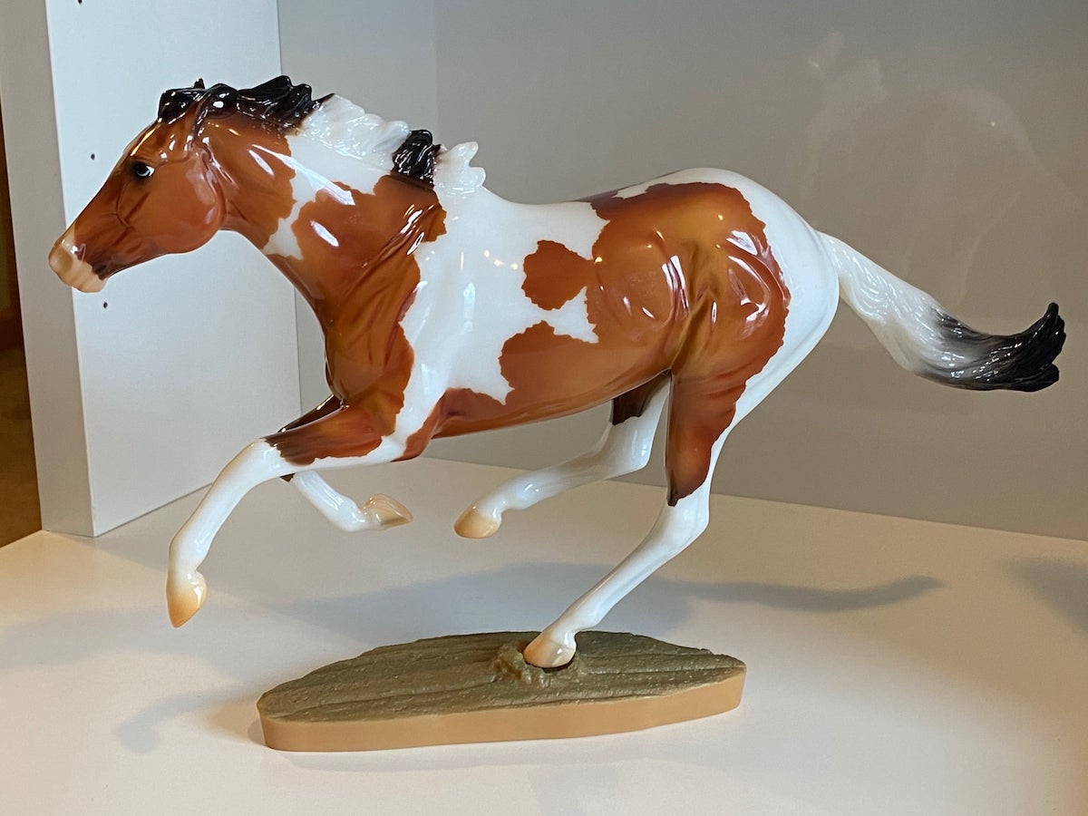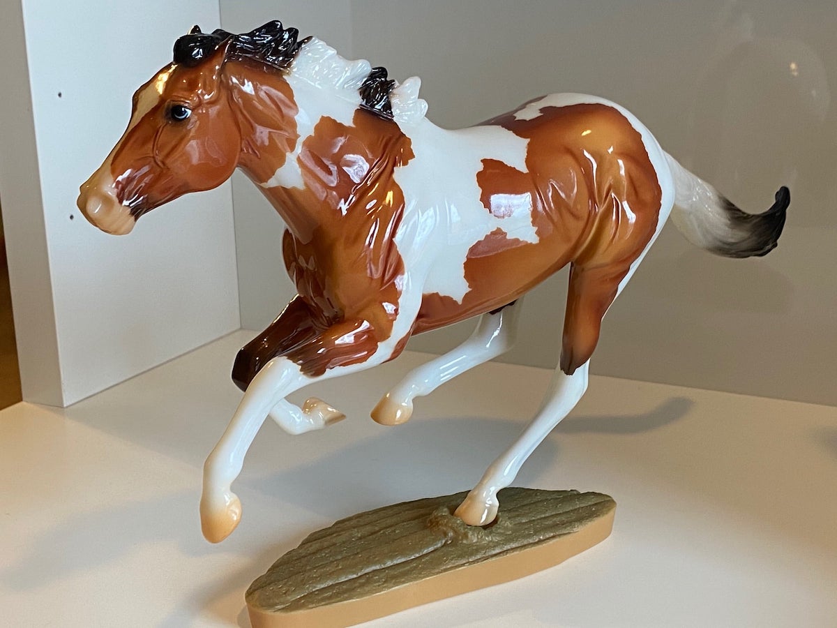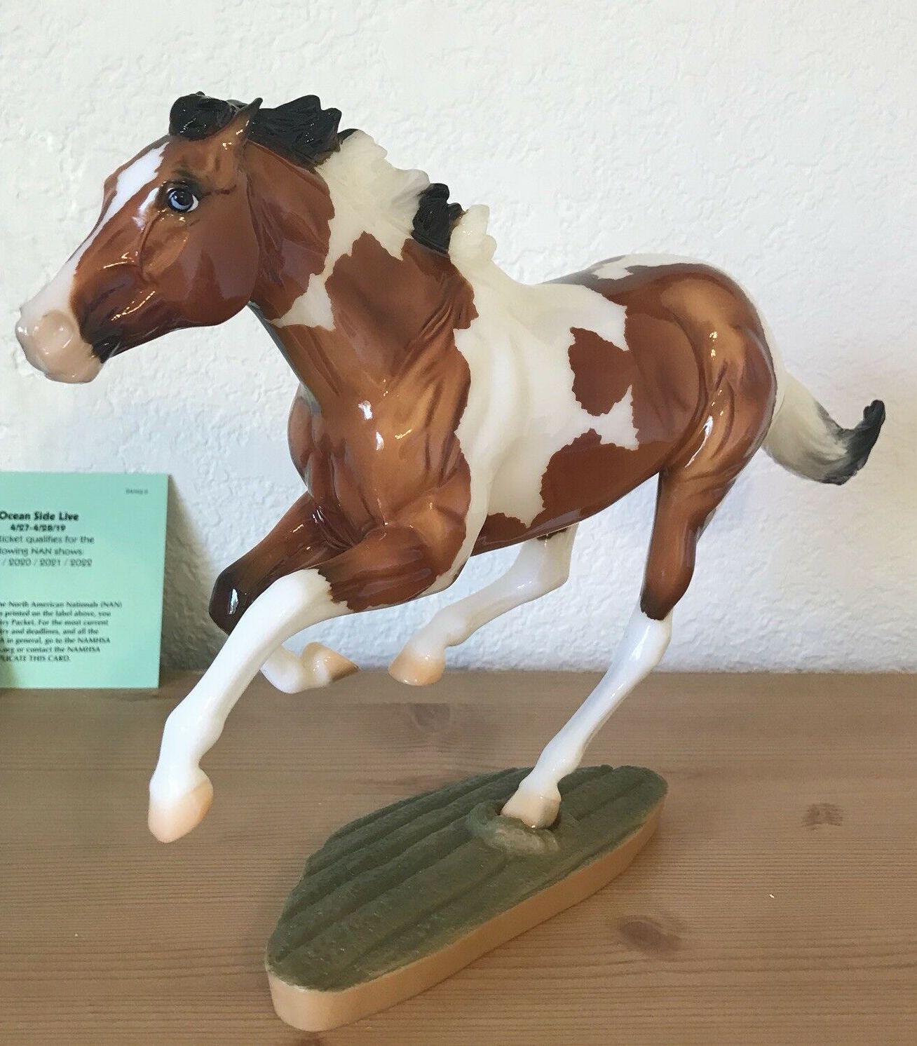 Glossy bay pinto; star-stripe-snip; 4 stockings; 1 blue eye; tan base; BreyerFest SR; 1/175