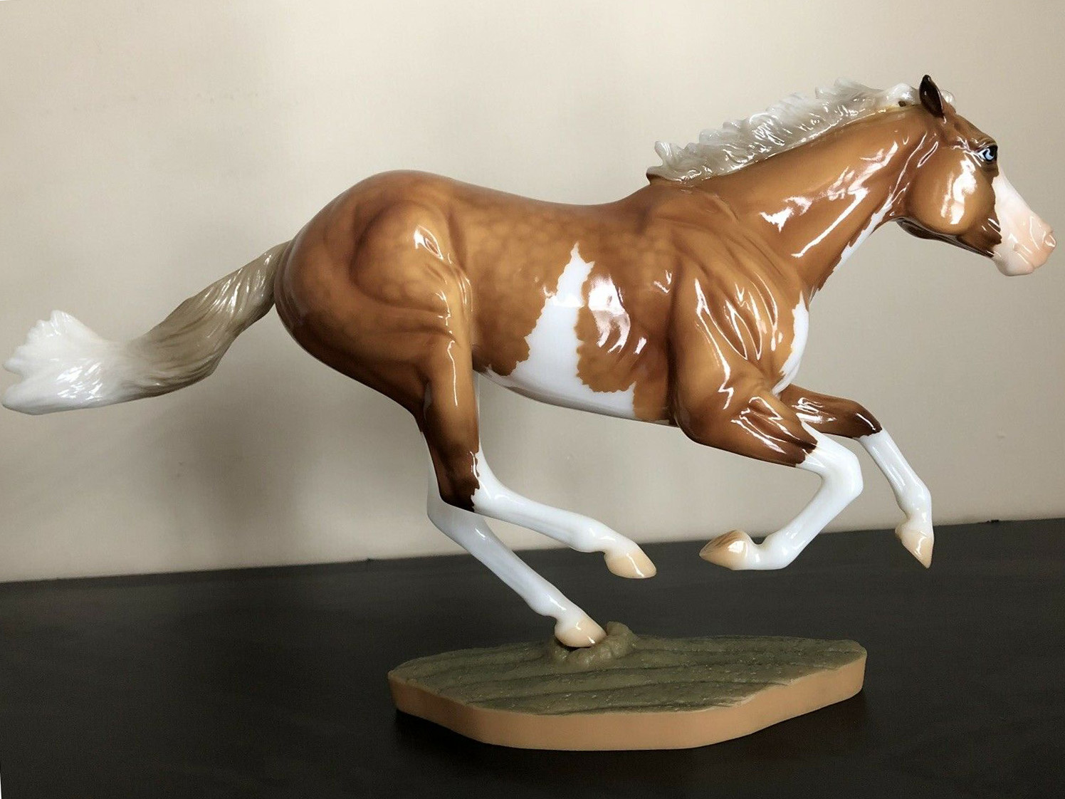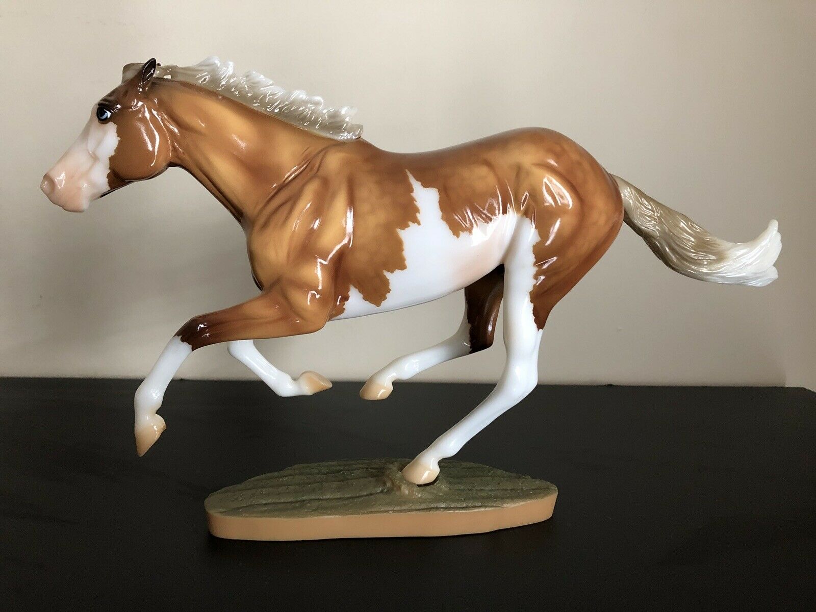 Glossy dark palomino pinto; dapples; apron face; 4 stockings; blue eyes; tan base; BreyerFest SR; 1/175