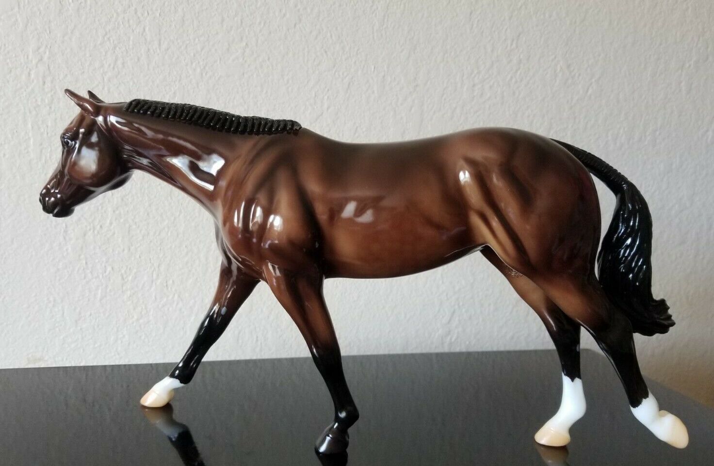 Glossy bay, dapples, star and snip, 3 socks, braided mane and tail version, stamped “BreyerFest 2019 30th Anniversary”, BreyerFest SR, 1/885