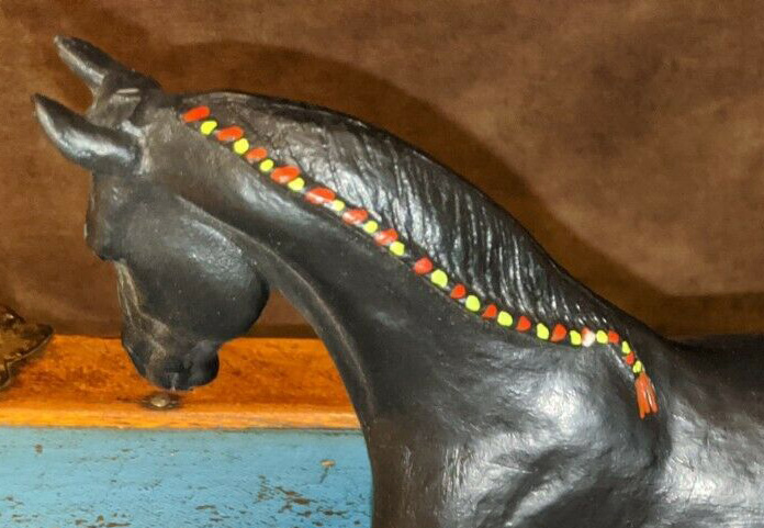 Matte black; stripe; 3 socks; green and red mane ribbons; Spiegel SR; 1/1300 – with Hanoverian