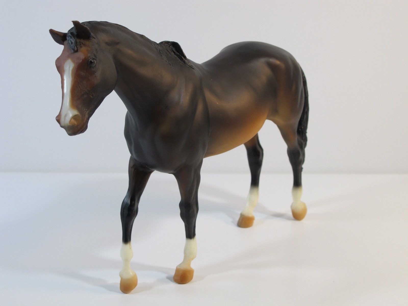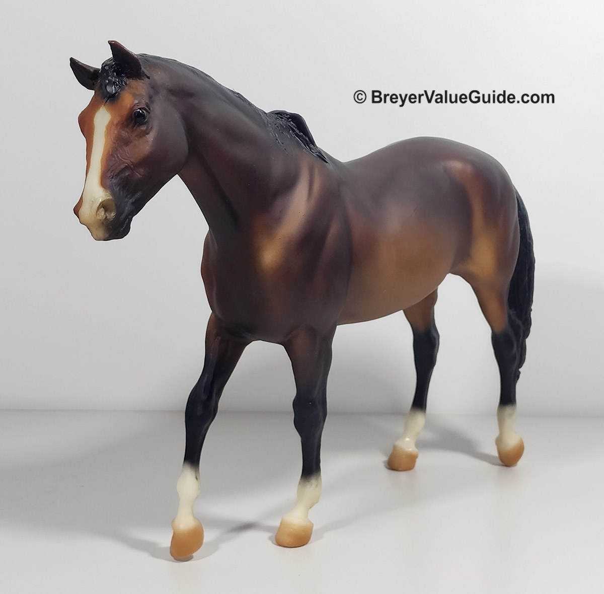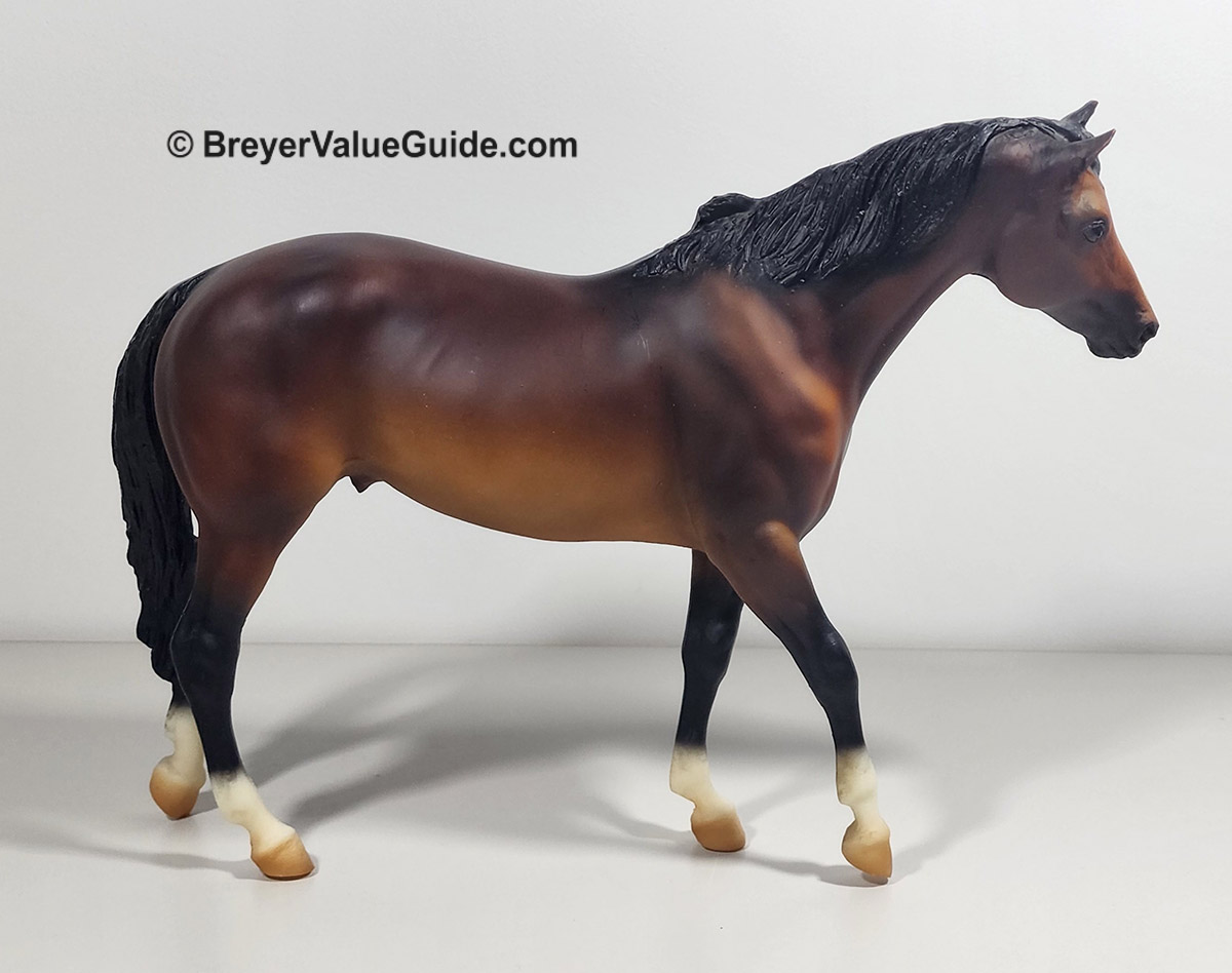 Matte dark shaded bay; blaze; 4 socks; Sears SR – with Indian Pony; Stock Horse Mare