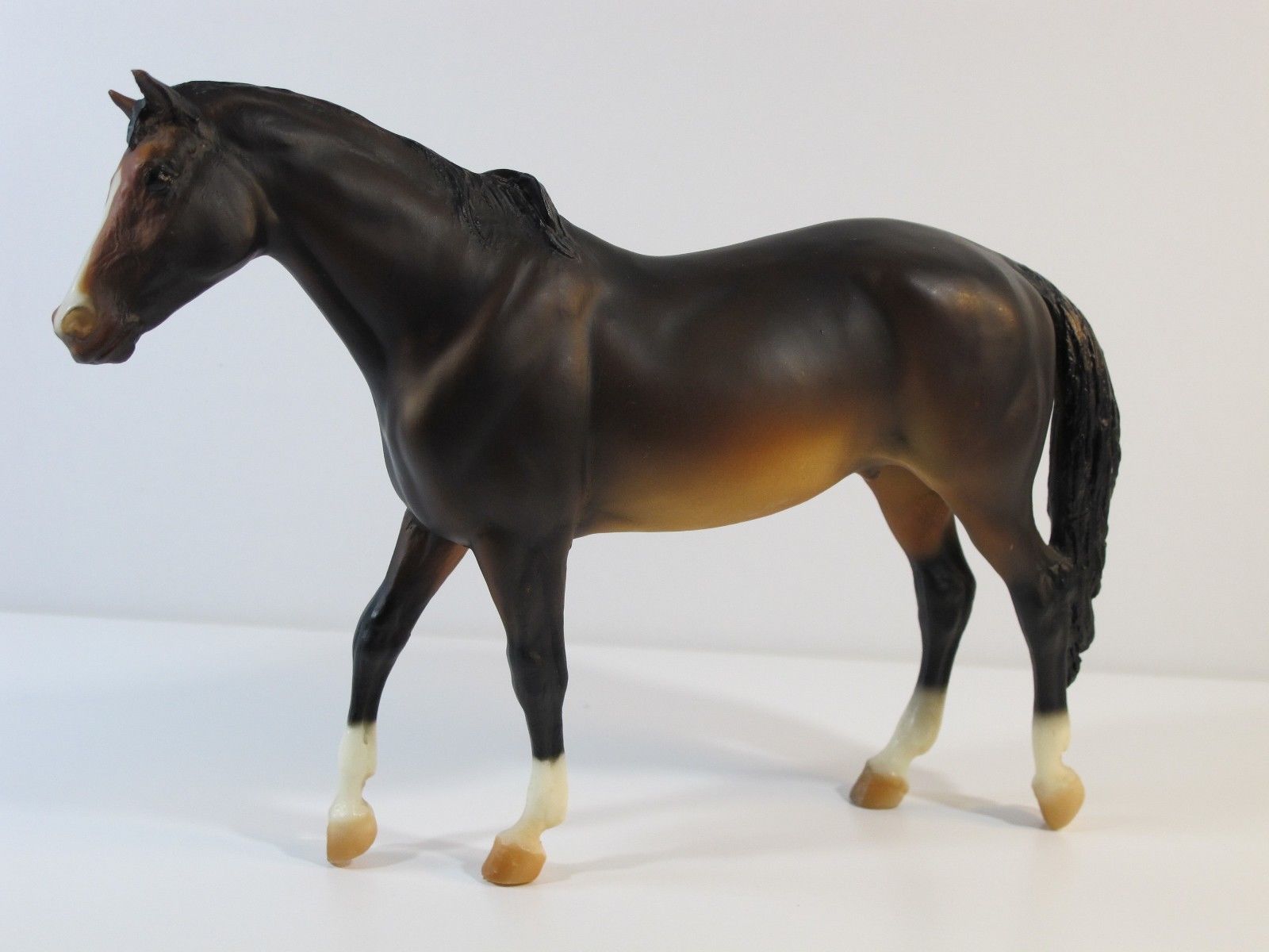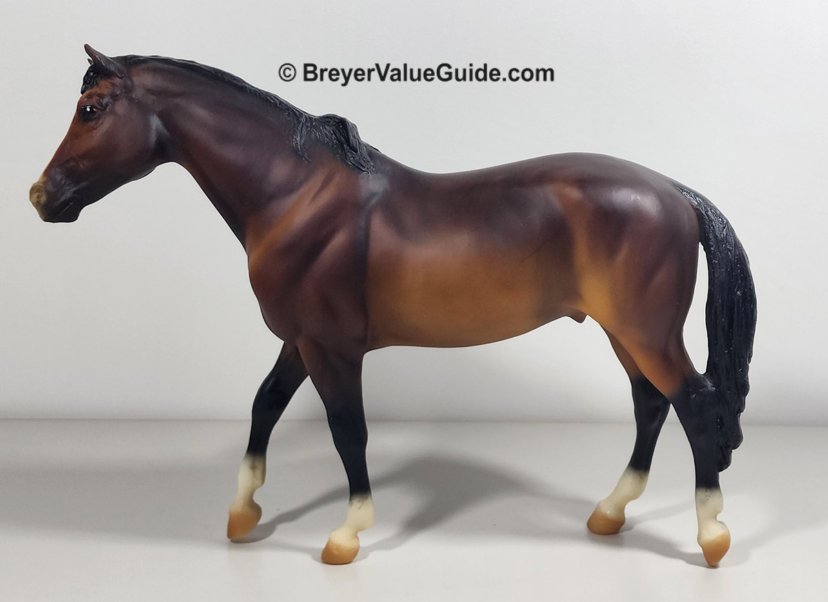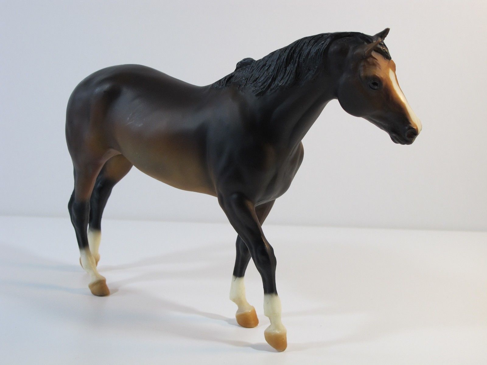 Matte dark shaded bay; blaze; 4 socks; Sears SR – with Indian Pony; Stock Horse Mare