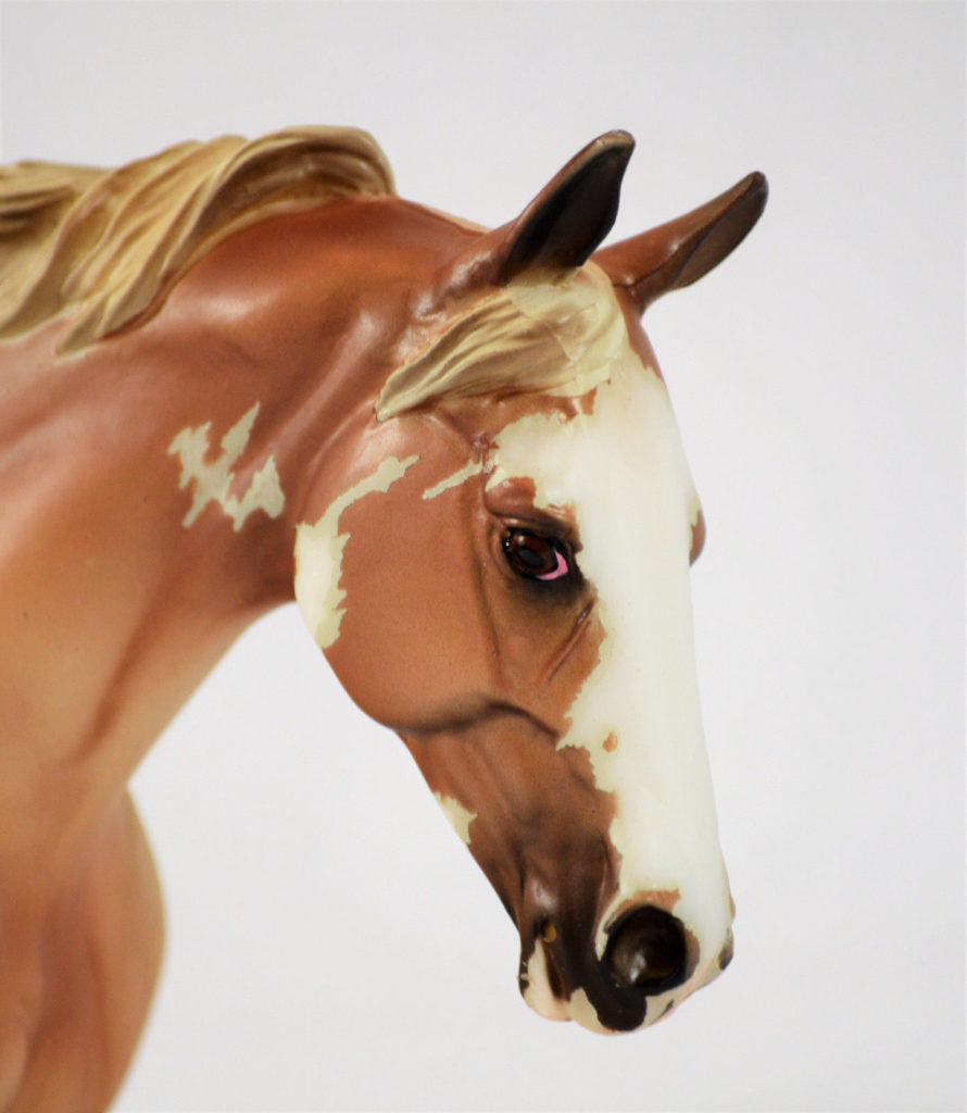Matte dun pinto; mapped and detailed markings; leg barring and dorsal stripe; flaxen mane and tail; stenciled wide blaze; brands on both shoulders; 1 front sock; 2 hind stockings; Premier Club SR