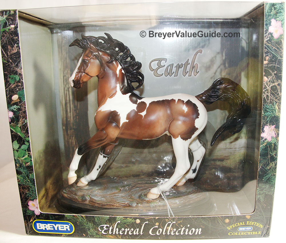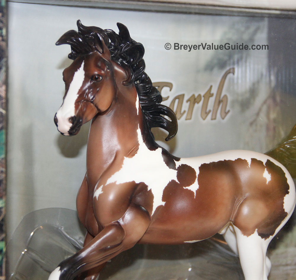 Matte bay pinto; dapples; wide blaze; 4 socks; with base and wood plinth