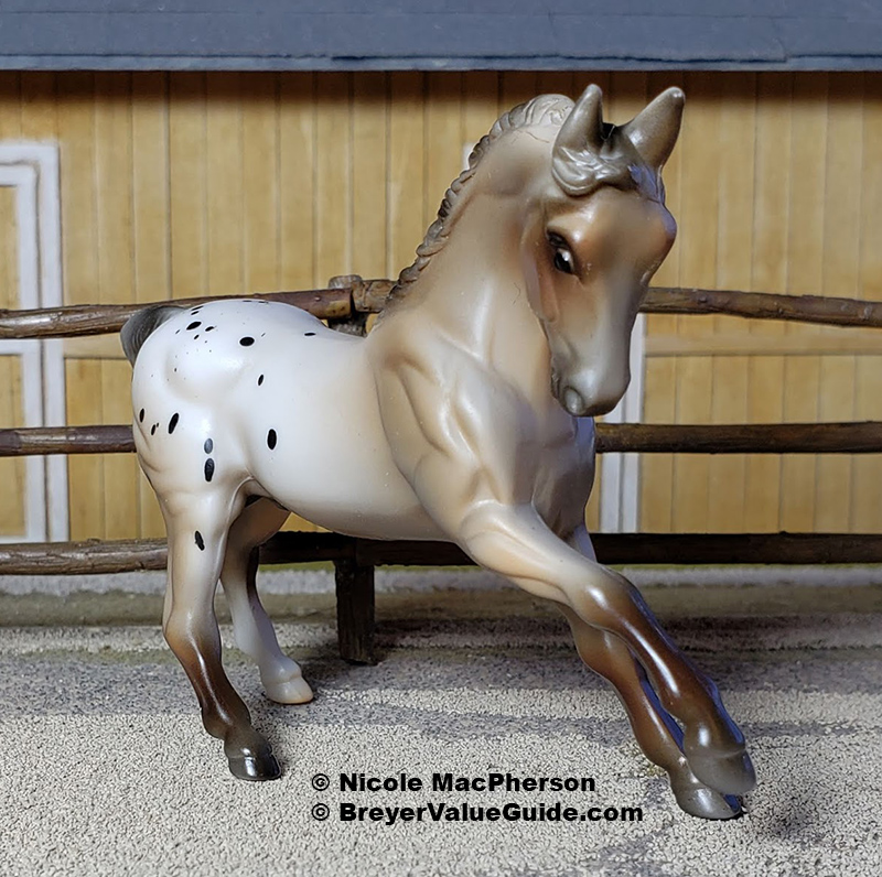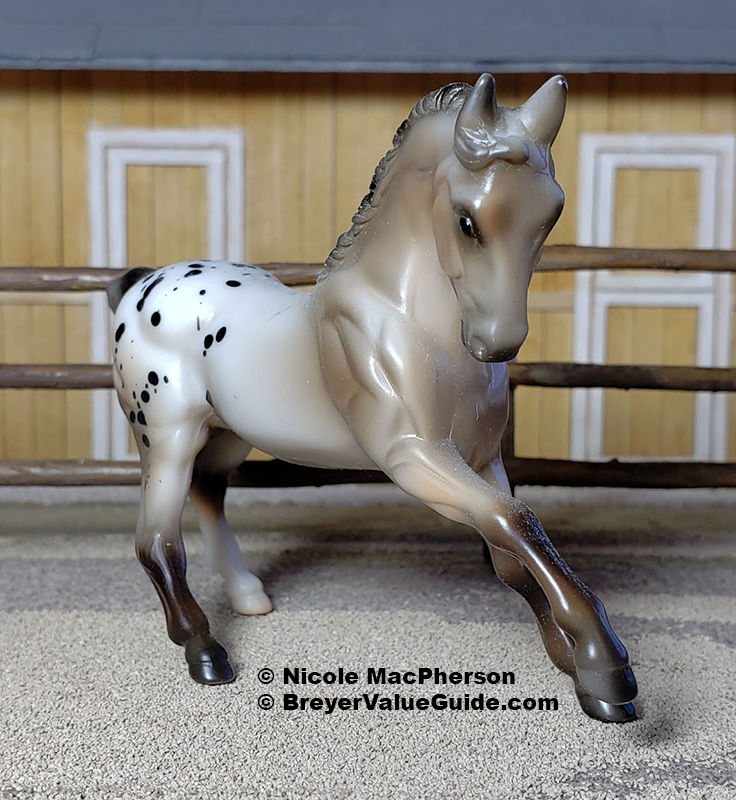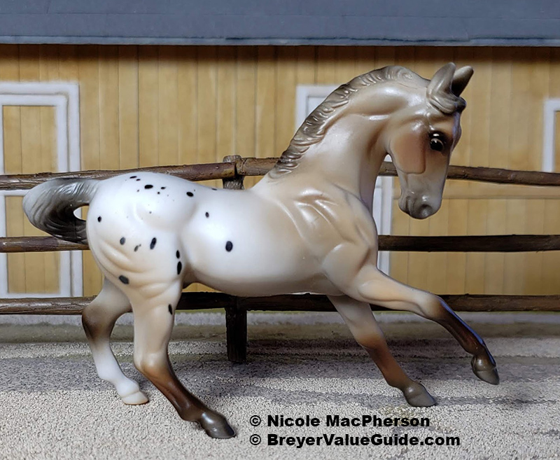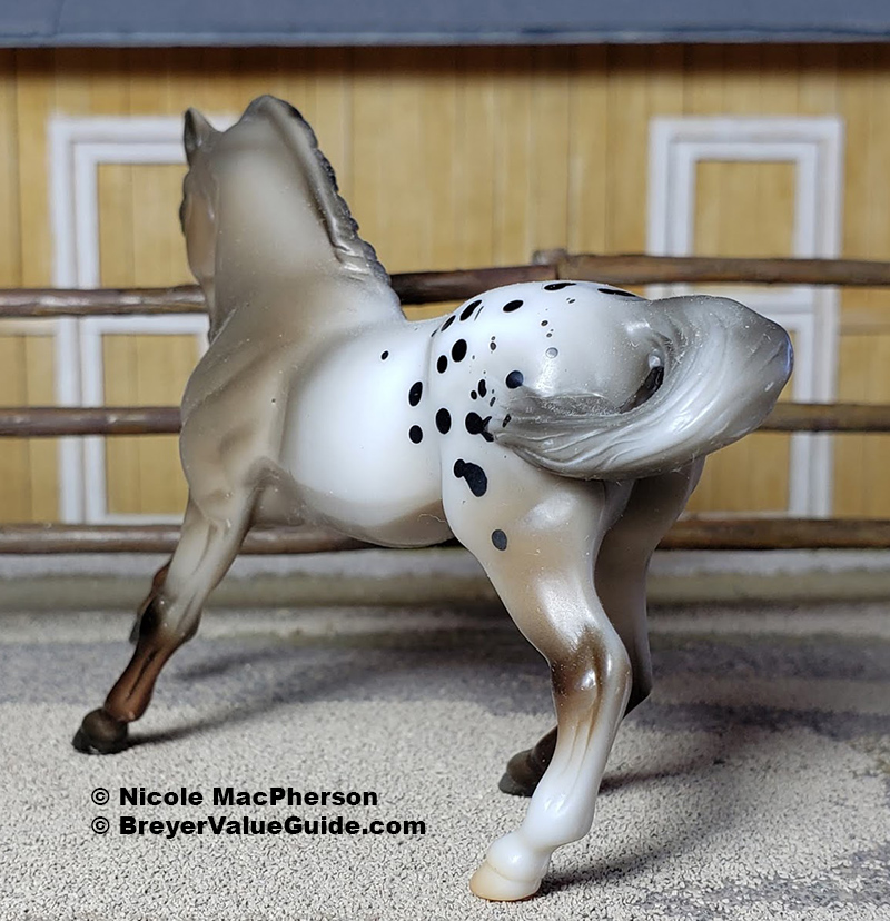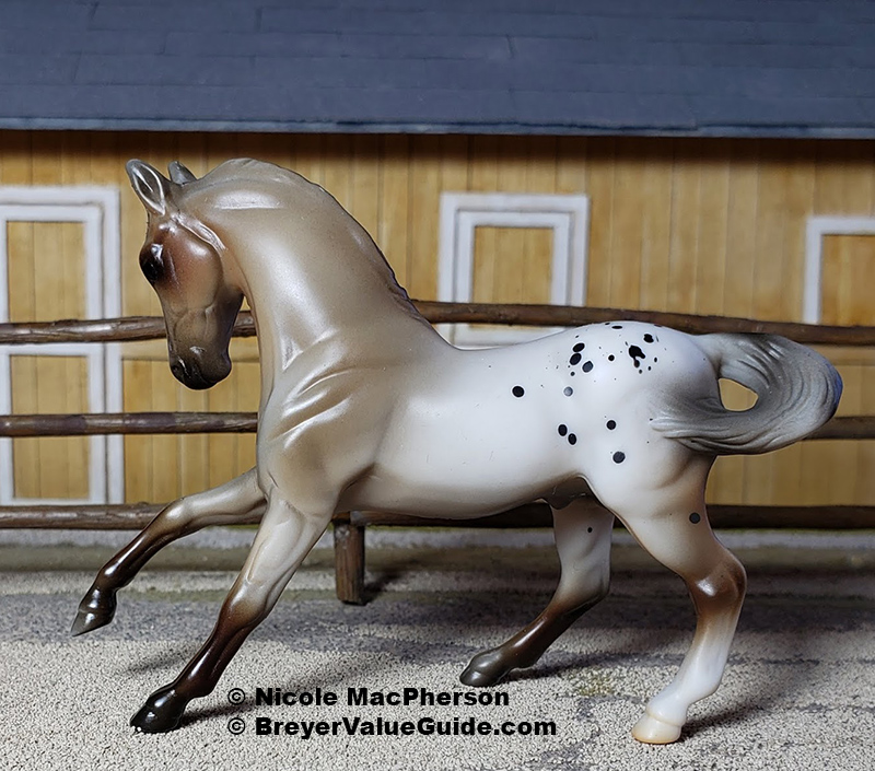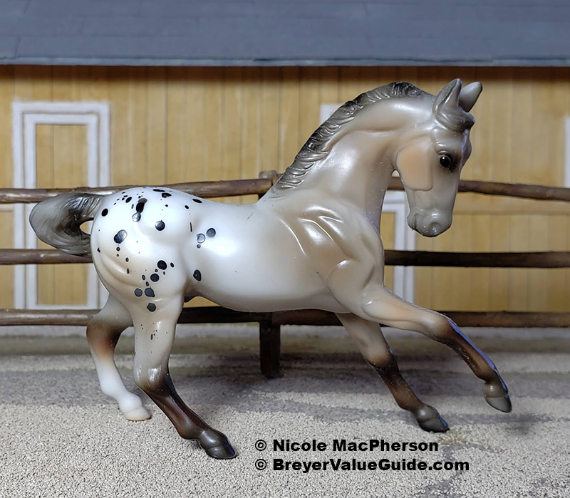 Matte rose grey appaloosa; black splash spots; solid face; grey shaded mane and tail; brown legs; 1 hind sock – with rider and tack