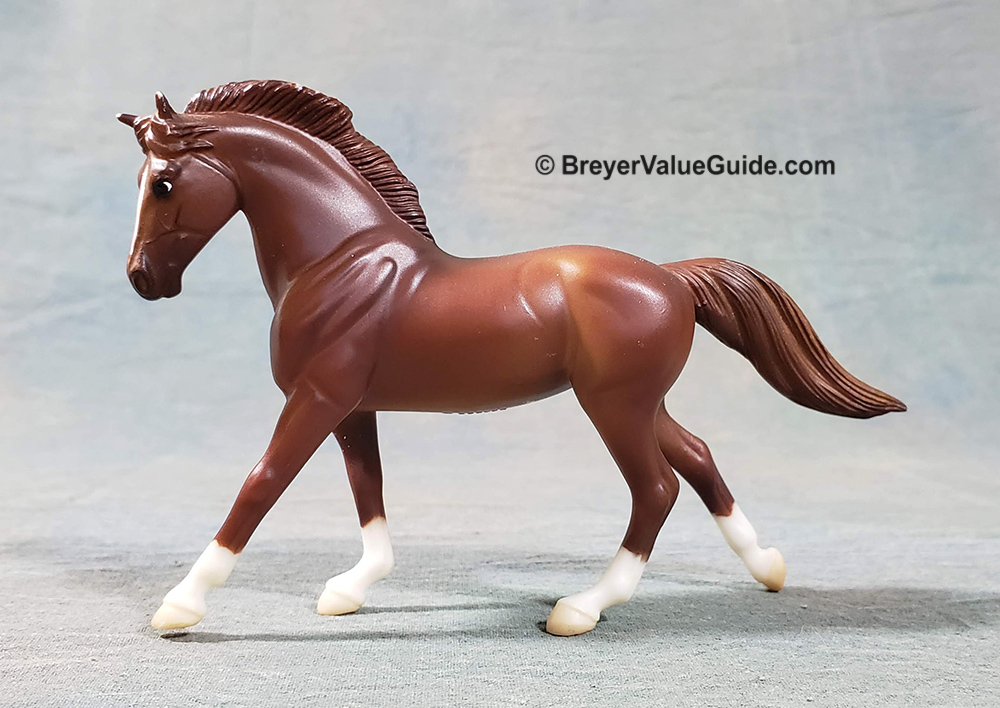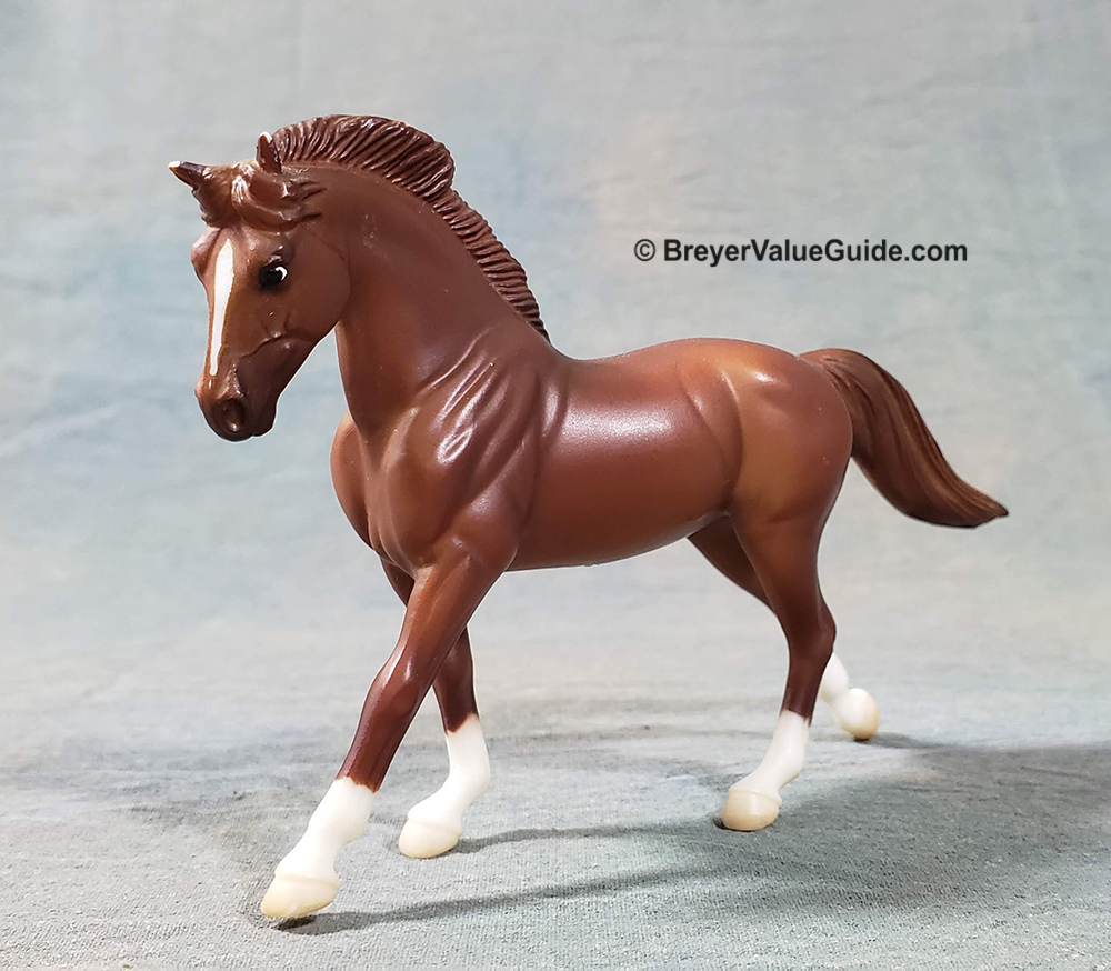 Matte dark chestnut; stripe; eye whites; 4 stenciled socks