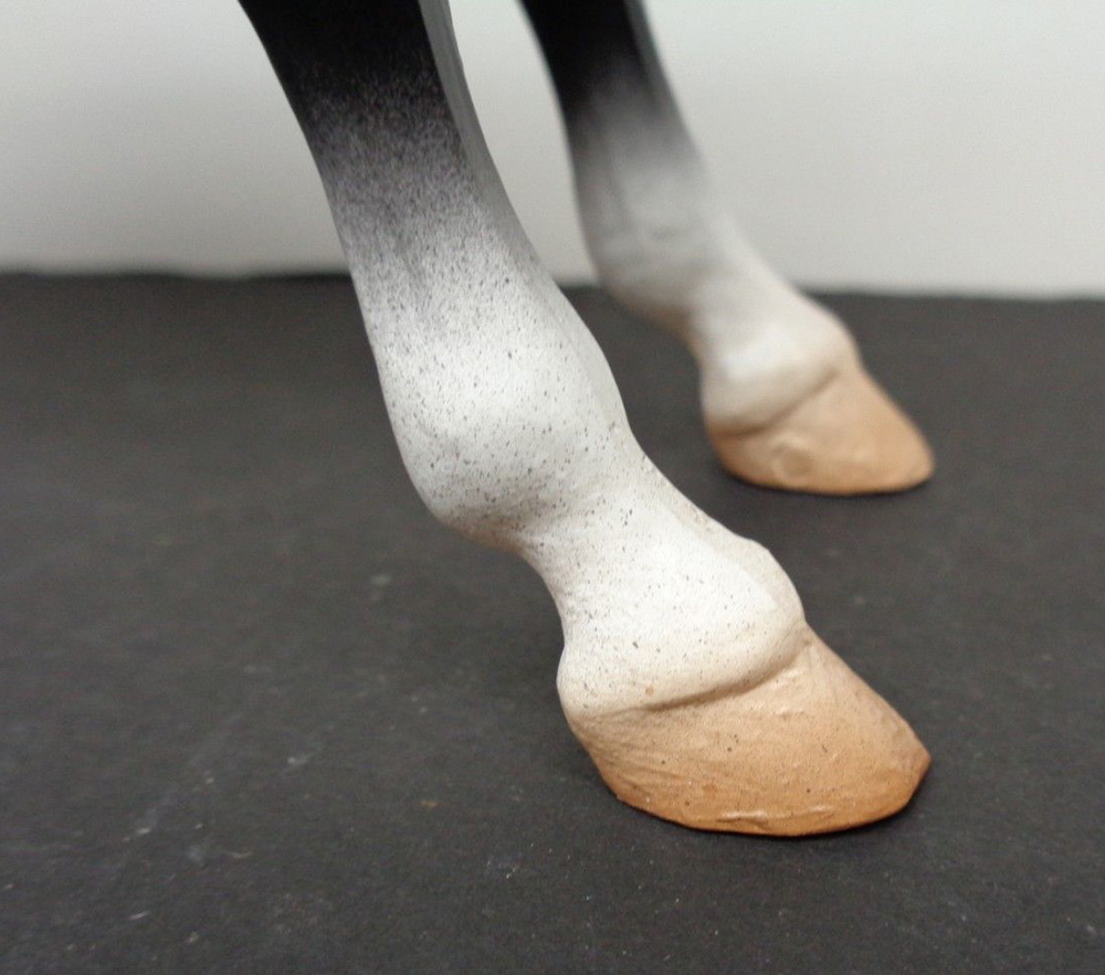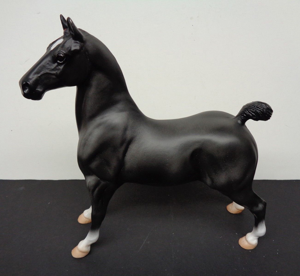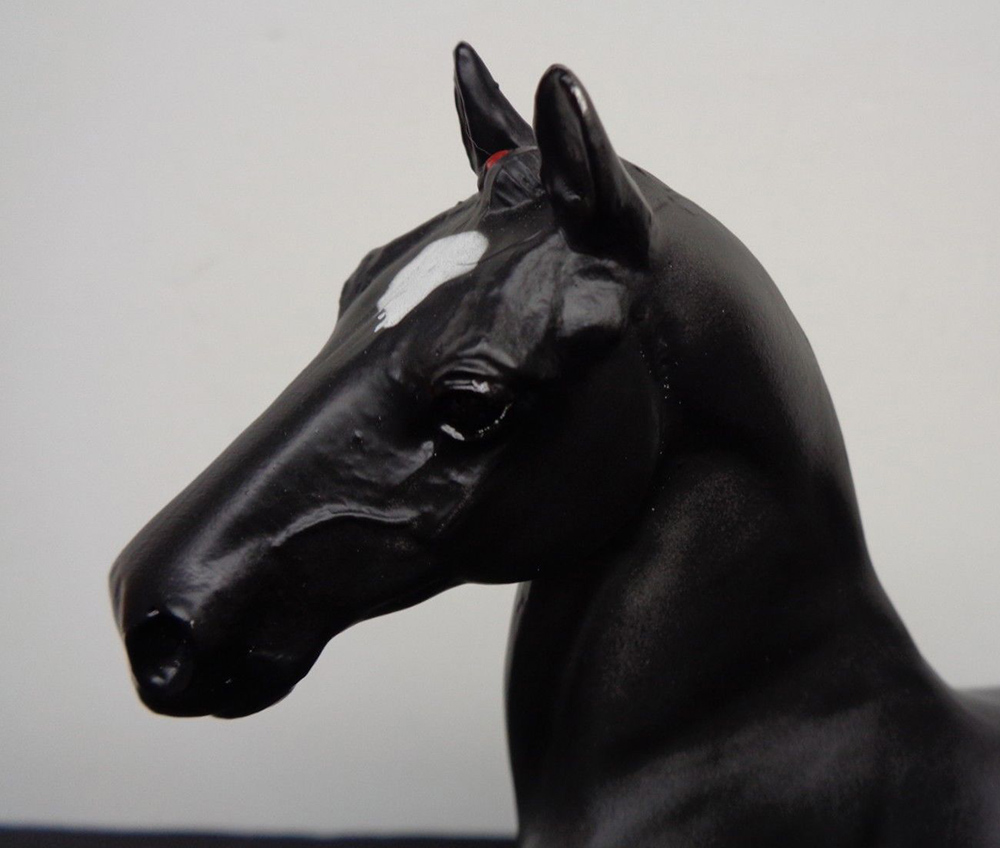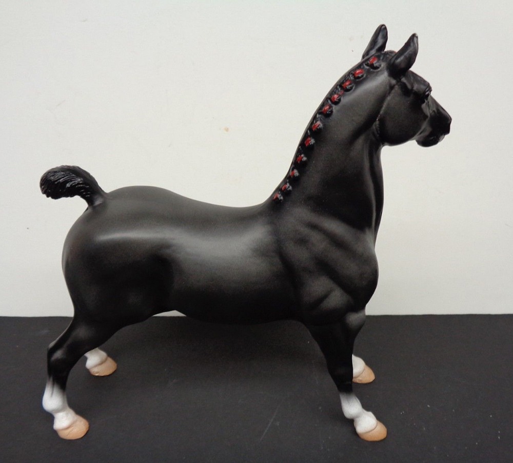 Matte black; star; 4 socks; red bands in mane; white basecoat chalky; BreyerFest SR; 1/200
