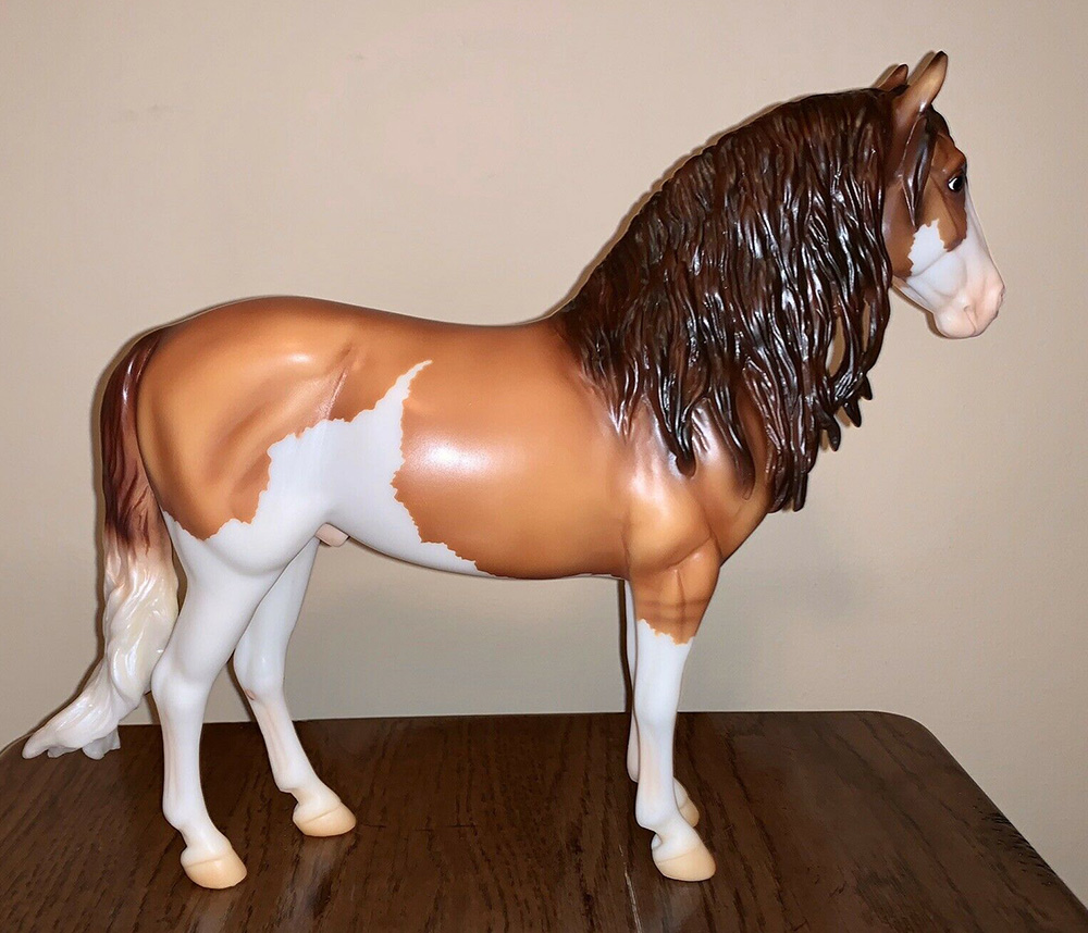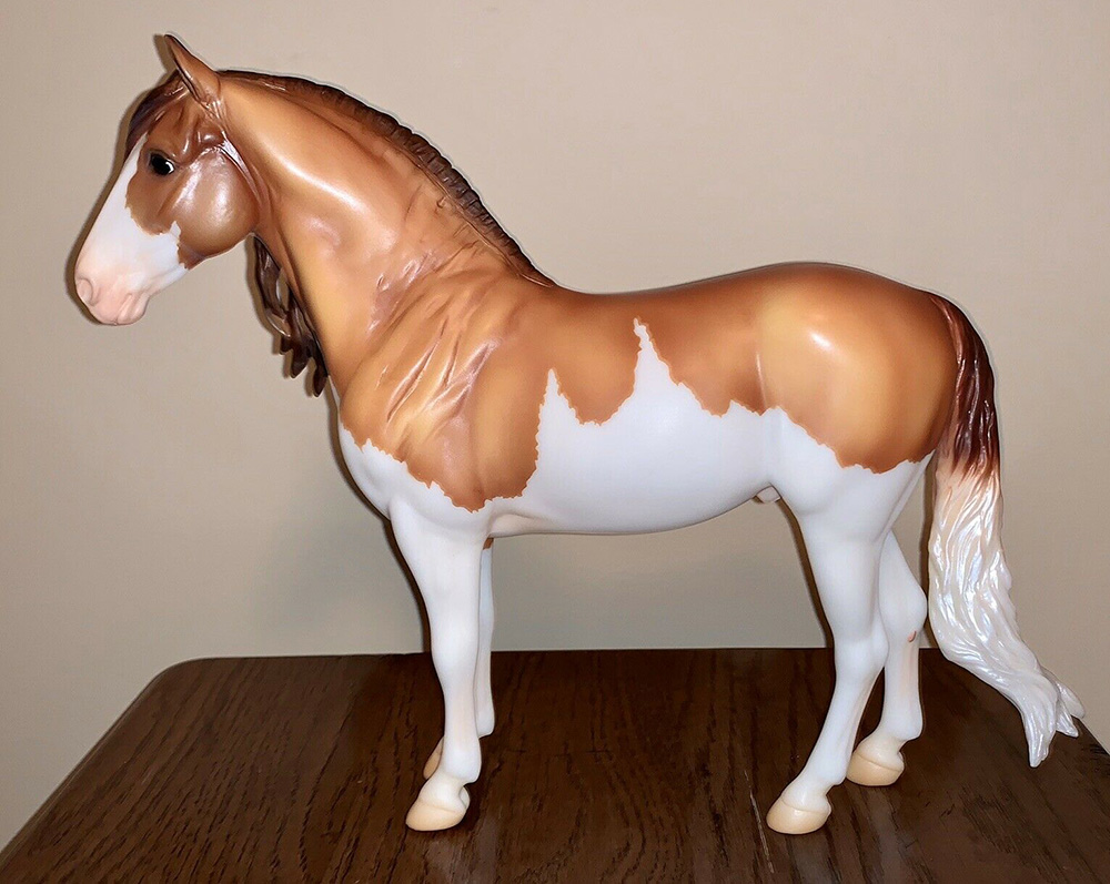 Matte red dun splash pinto, stenciled apron face; white legs; has a soft white opaque basecoat; has “Collector Club 2020” on his belly in gold writing; Web SR